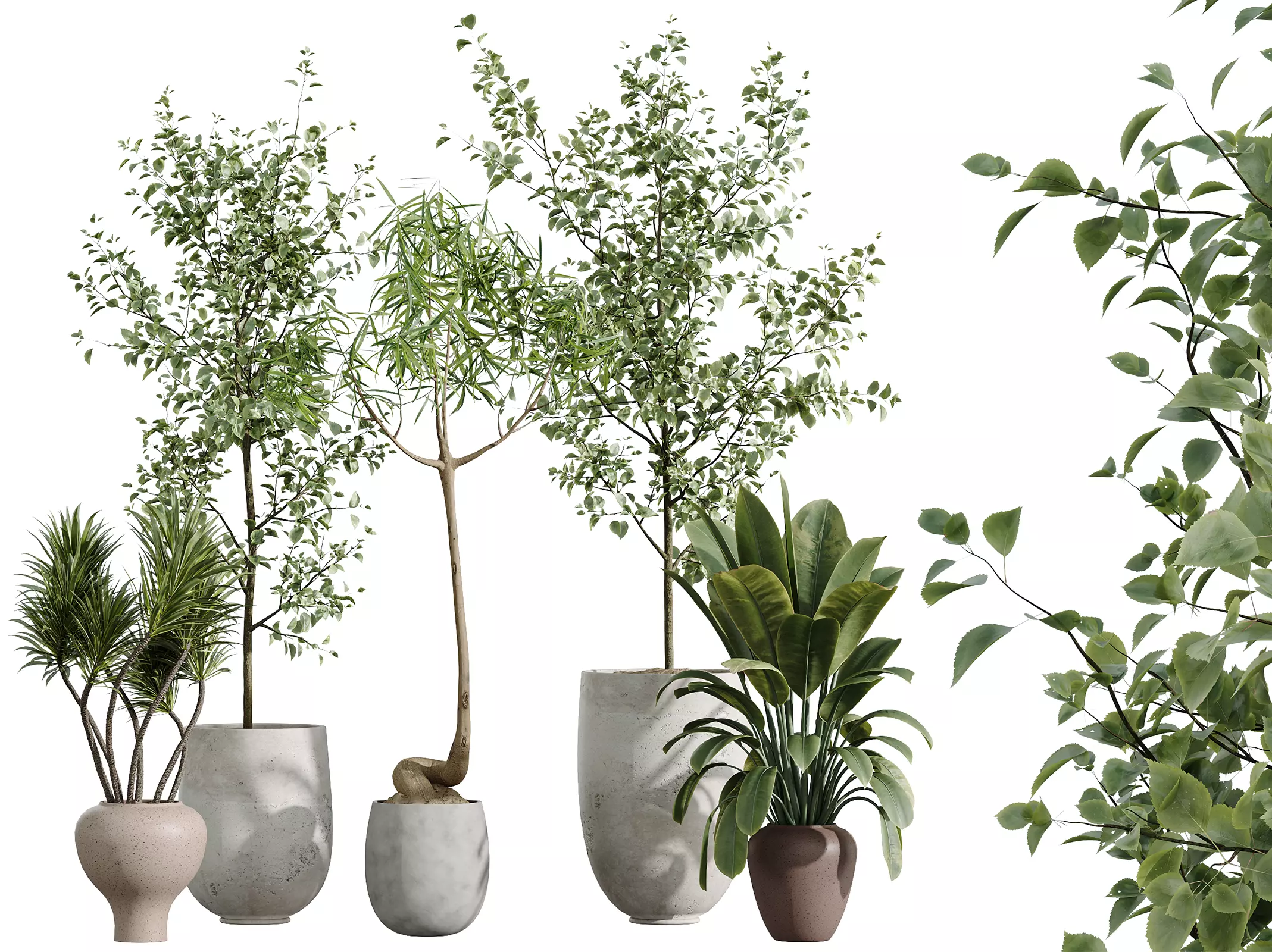 This elegant indoor set weaves together a rich narrative of texture, form, and botanical heritage. Anchored by the timeless beauty of the European Olive (Olea Europaea) and the delicate lightness of Beech and Eucalyptus foliage, the collection captures the soul of Mediterranean minimalism. The sculptural trunk of Japandi Ficus Dracaena Marginata, the lush curves of Ficus Robusta, and the spiky character of Yucca Aloifolia introduce a rhythmic variation that elevates architectural scenes. Each plant is housed in a distinctive hand-crafted pot—ranging from raw concrete to sculpted ceramic—designed to accentuate the organic forms and complement modern interior design with sophistication and calm.