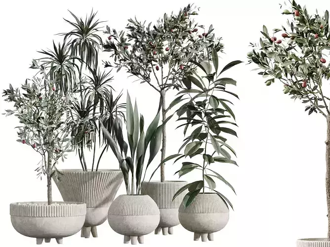 A refined indoor collection combining the timeless elegance of Olive Tree, the lush vertical form of Dracaena Warneckii Lemon, the structured beauty of Aspidistra Elatior, and the tropical richness of Ficus Cyathistipula. Each plant has been crafted with high precision for architectural visualization and interior design scenes. The natural flow of leaves and balanced form bring a realistic and sophisticated atmosphere to modern or classic environments. All pots share a cohesive sculpted design made from stone-textured material to enhance the harmony of the composition.