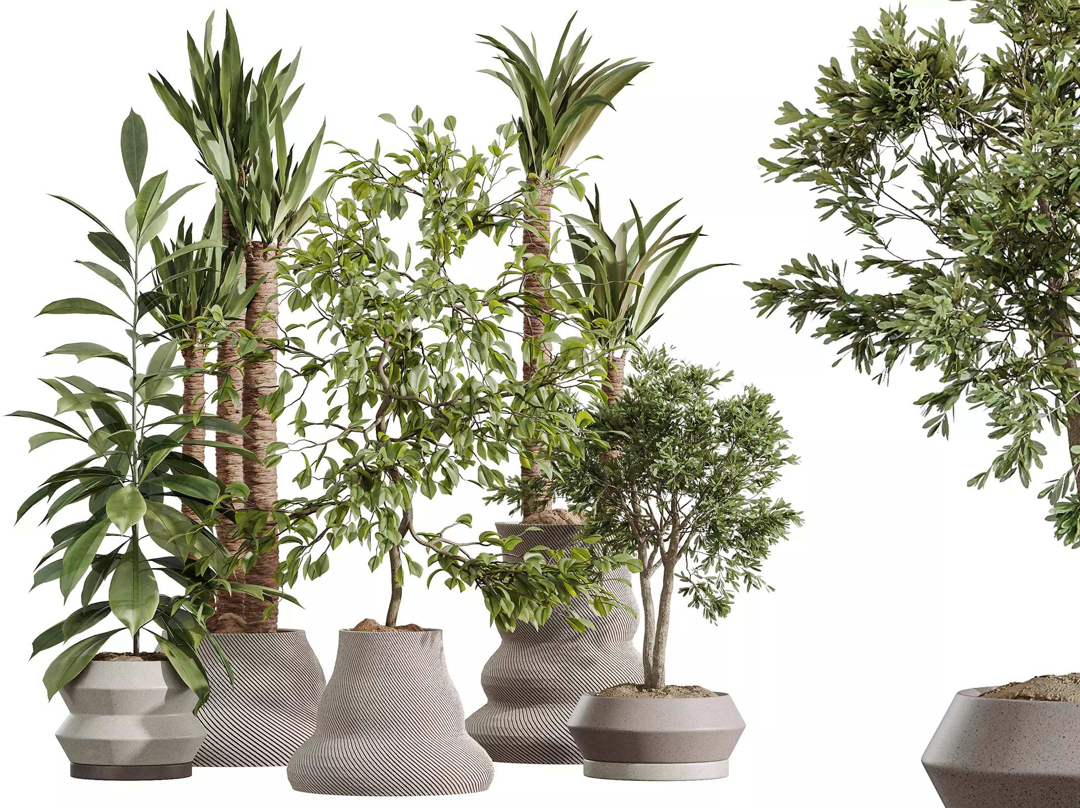 AV Indoor Plants Set 380 presents an elegant fusion of nature and design — featuring Ficus Cyathistipula, Ficus Dracaena Marginata, Yucca Elephantipes Gigantea, and Arbequina Olive. Each species has been modeled with scientific accuracy and artistic sensitivity, making this collection a perfect addition for high-end interiors and realistic architectural scenes.