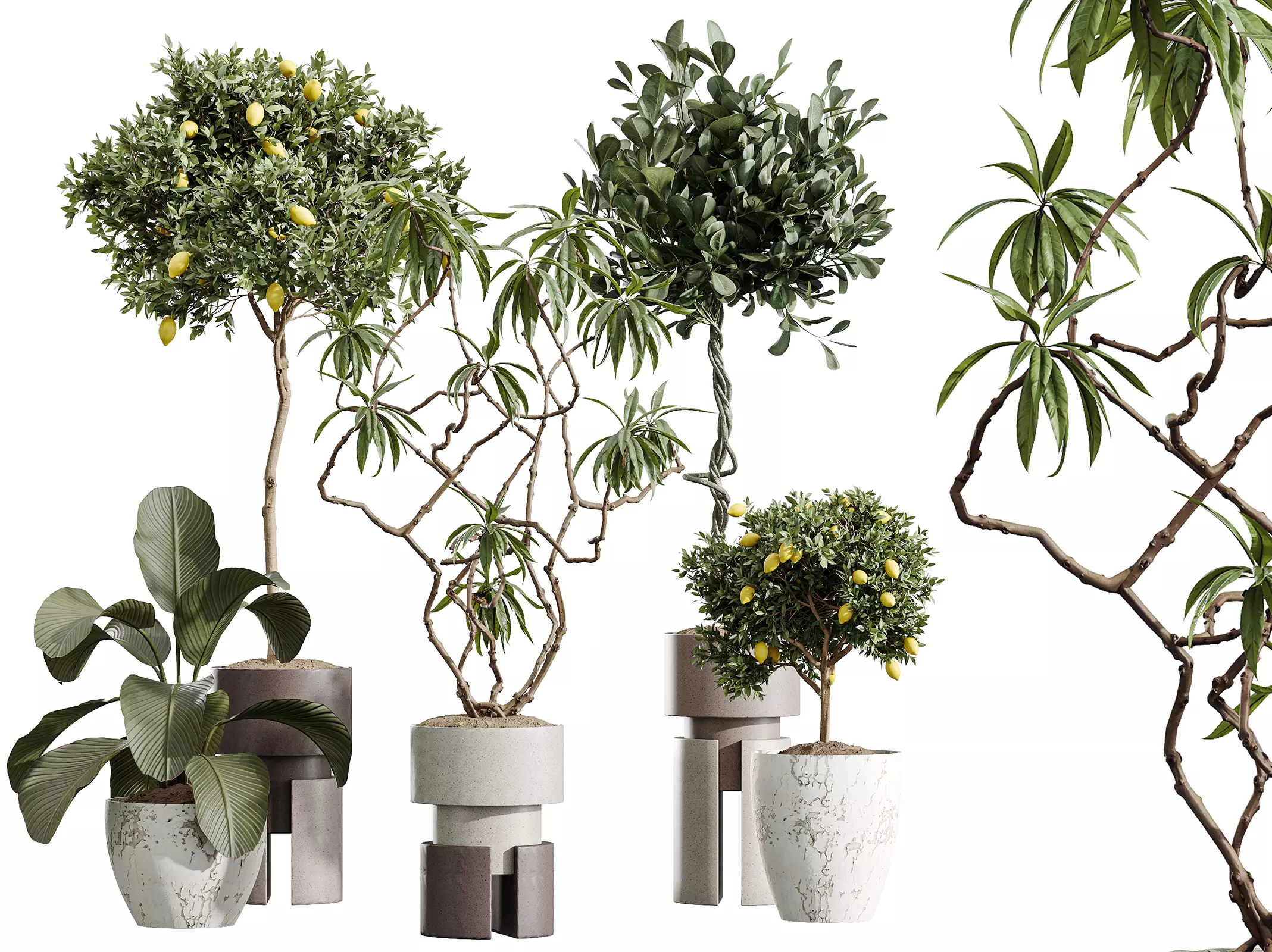 The Mandarin Citrus Fruit tree adds vibrant color and organic charm with its detailed branches and realistic fruit clusters. The Ficus Microcarpa brings sculptural movement and sophisticated character through its twisted trunk and refined crown. The Calathea Lutea introduces broad, architectural leaves with soft natural gradients, adding a modern tropical presence. Finished with a selection of minimalist Japandi-inspired pots, this set becomes an instant interior design upgrade — perfect for luxury homes, boutique hotels, showrooms, cafes, and stylish office spaces.