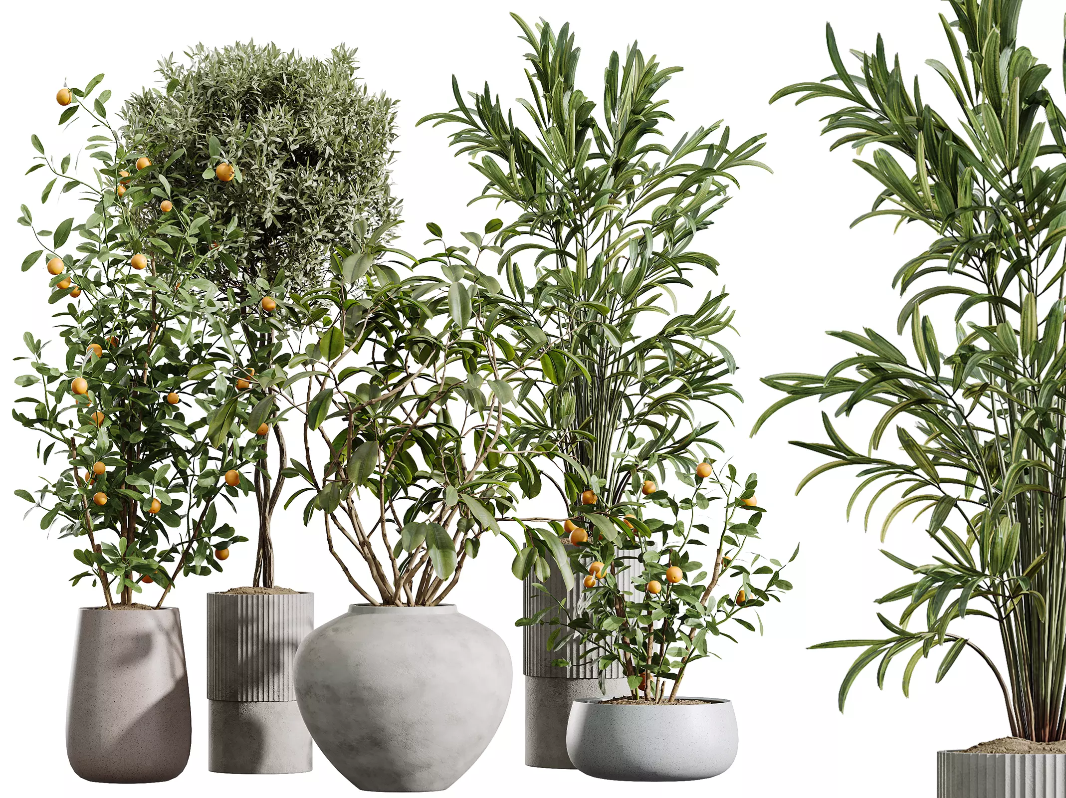 Bring a new level of elegance and natural harmony into your interior scenes with the AV Indoor Plants Set 410 — a premium collection of China Orange Tree, Areca Palm, Ficus Dracaena Marginata, and Olive Tree.