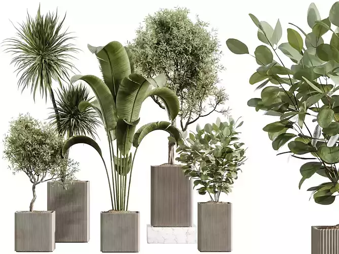 Introduce a refined balance of Mediterranean charm and tropical structure into your interior visualizations with this premium indoor plant collection featuring Eucalyptus Bouquet, Chemlali Olive Tree, Ravenala Banana, and Spineless Yucca Palm. Each plant is carefully modeled to reflect realistic foliage textures, natural branching, and authentic proportions, making this set ideal for professional interior archviz and design projects.