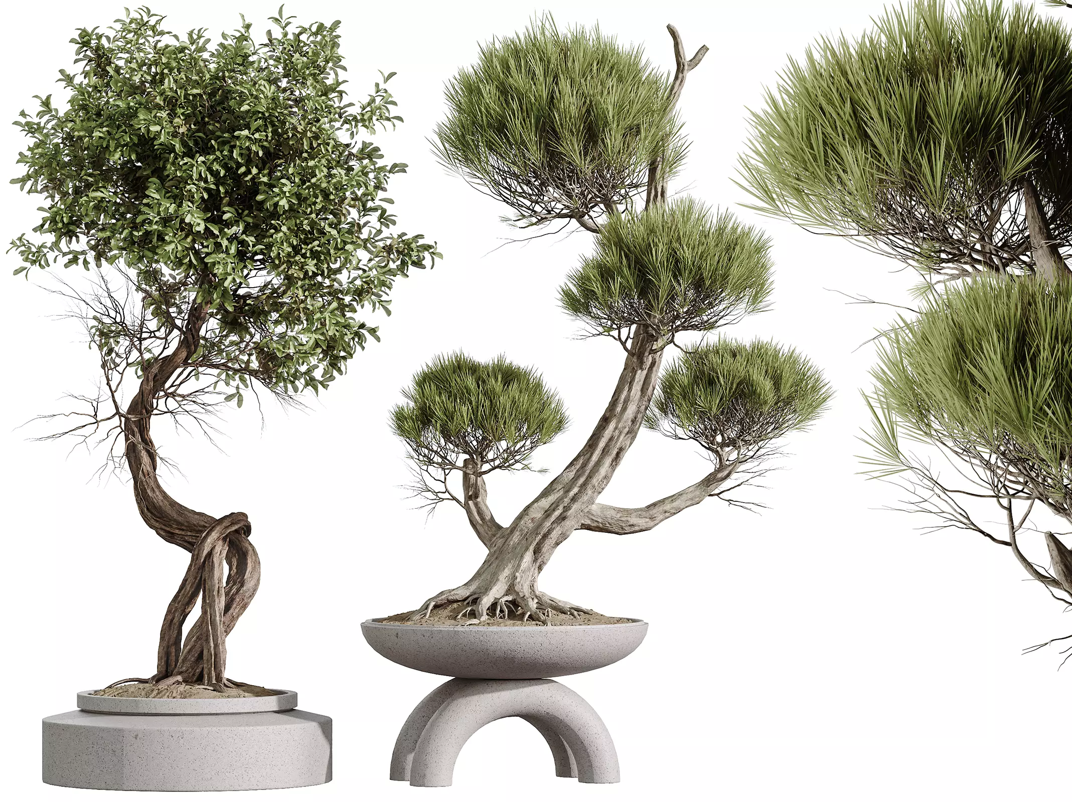 Bring timeless elegance and sculptural refinement to your interior scenes with this premium bonsai collection featuring Ficus Retusa Microcarpa Bonsai Ginseng and Bonsai Pinus Pentaphylla (Thunbergii). Each bonsai is meticulously crafted to capture the artistic balance, aged character, and expressive forms that define traditional bonsai aesthetics.