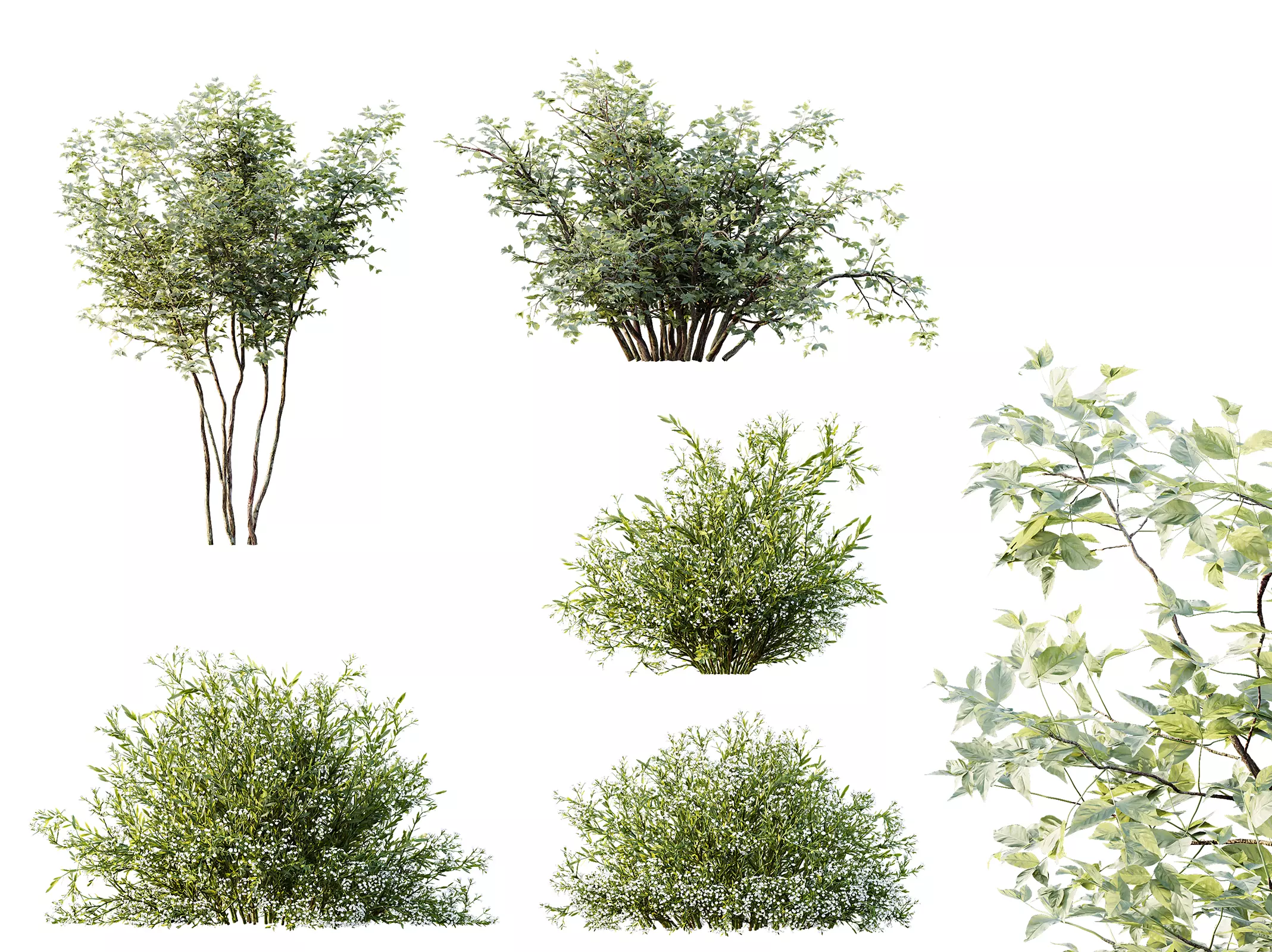 AV Spring Bushes Set — a beautifully detailed collection of five natural spring shrubs featuring fine branching and soft white blossoms. Each bush is carefully designed to recreate the realistic growth patterns and natural light response of seasonal garden plants, ideal for exterior visualization and landscape rendering.