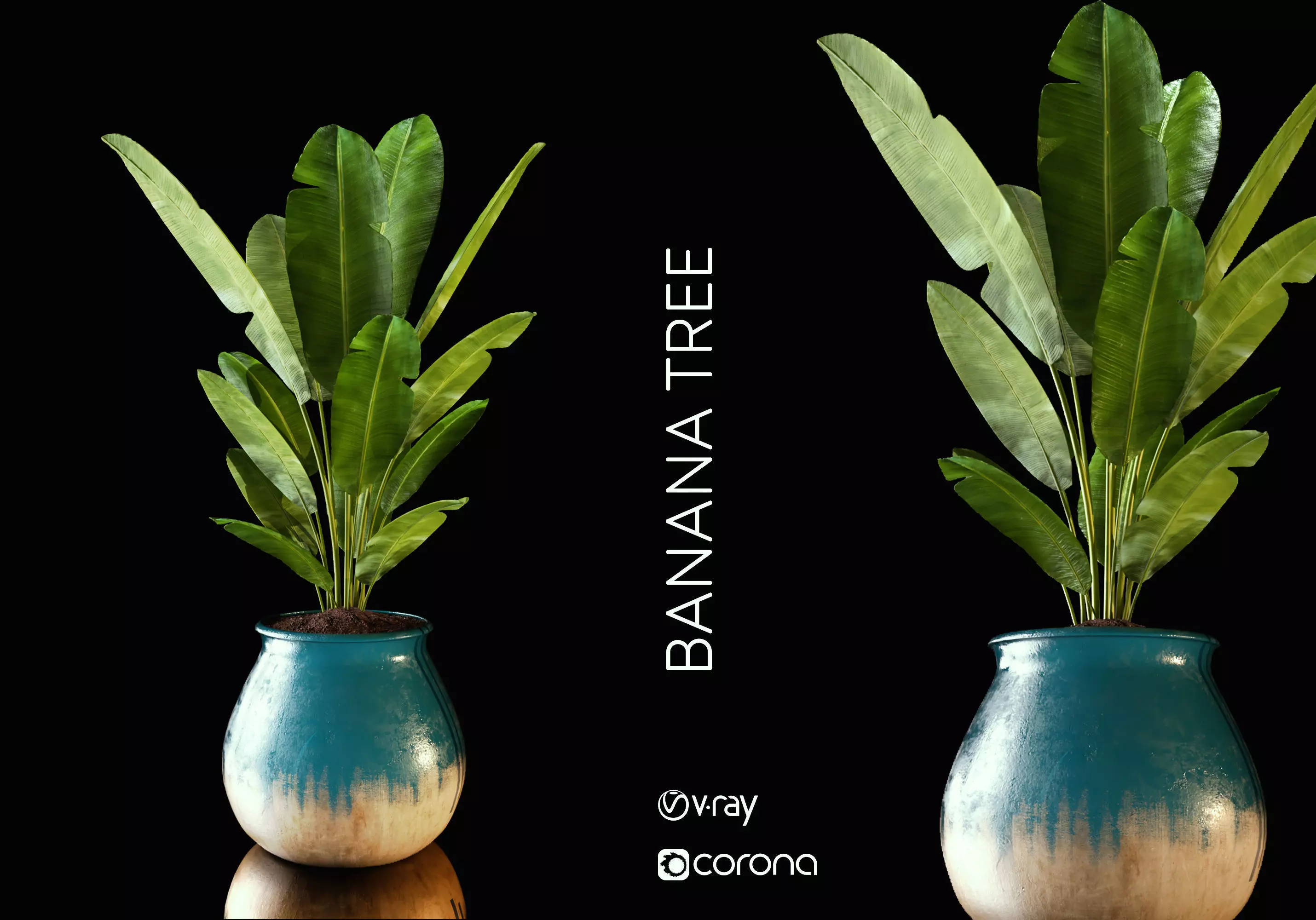 banana tree in a ceramic blue vase suitable for an interior area. (bedroom, kitchen, living room, terrace, cafe, bar, restaurant)