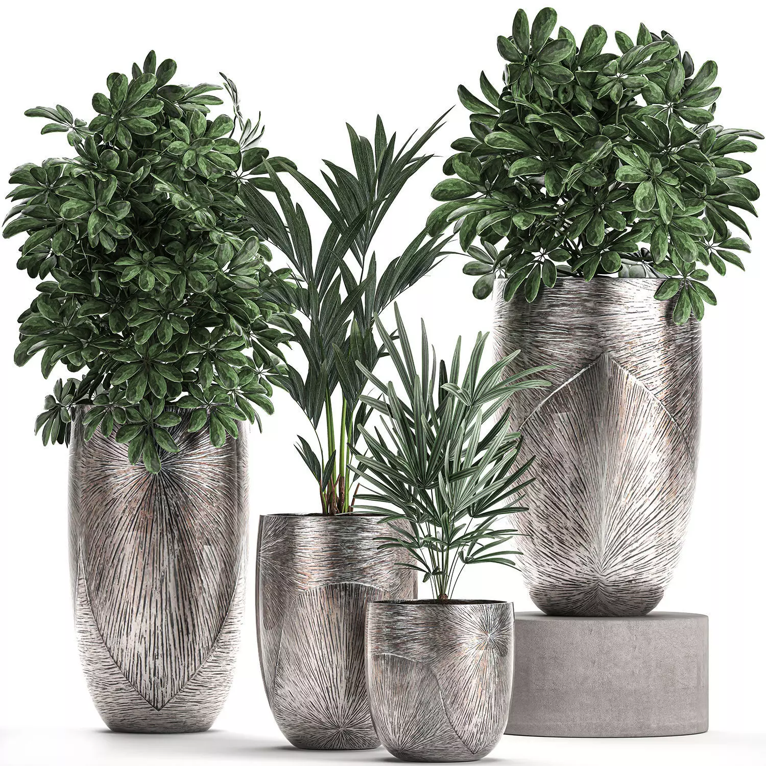 Ornamental plants for the street and interior in luxury flowerpots.Houseplantsexotic plantsTropical plants in potsluxury, silverScheffleraHowea forsterianaDate palmRaphis Palm, Rhapis excelsa