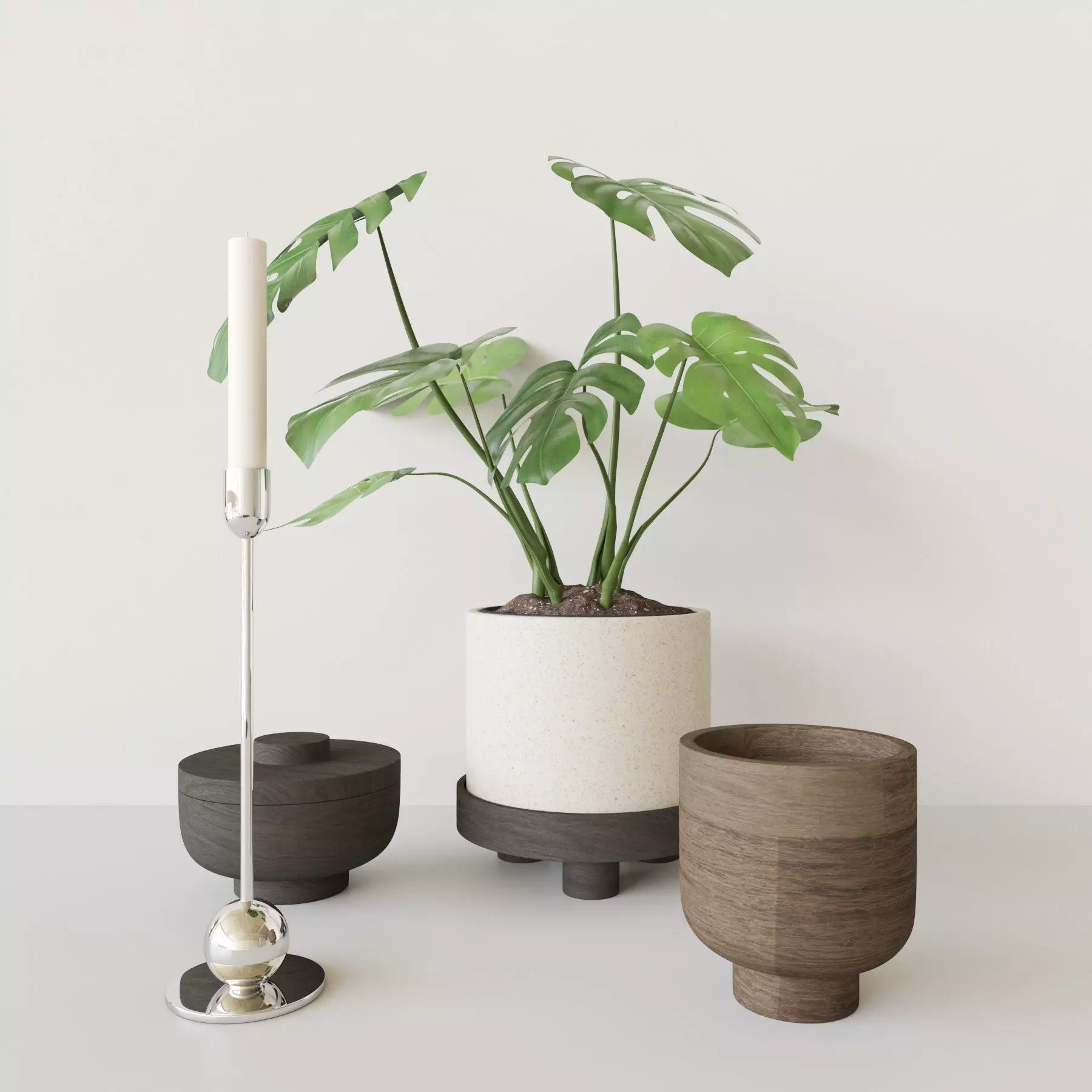 This is a realistic looking 3d model of a decorationset with a monstera, bowl box and candleholder.