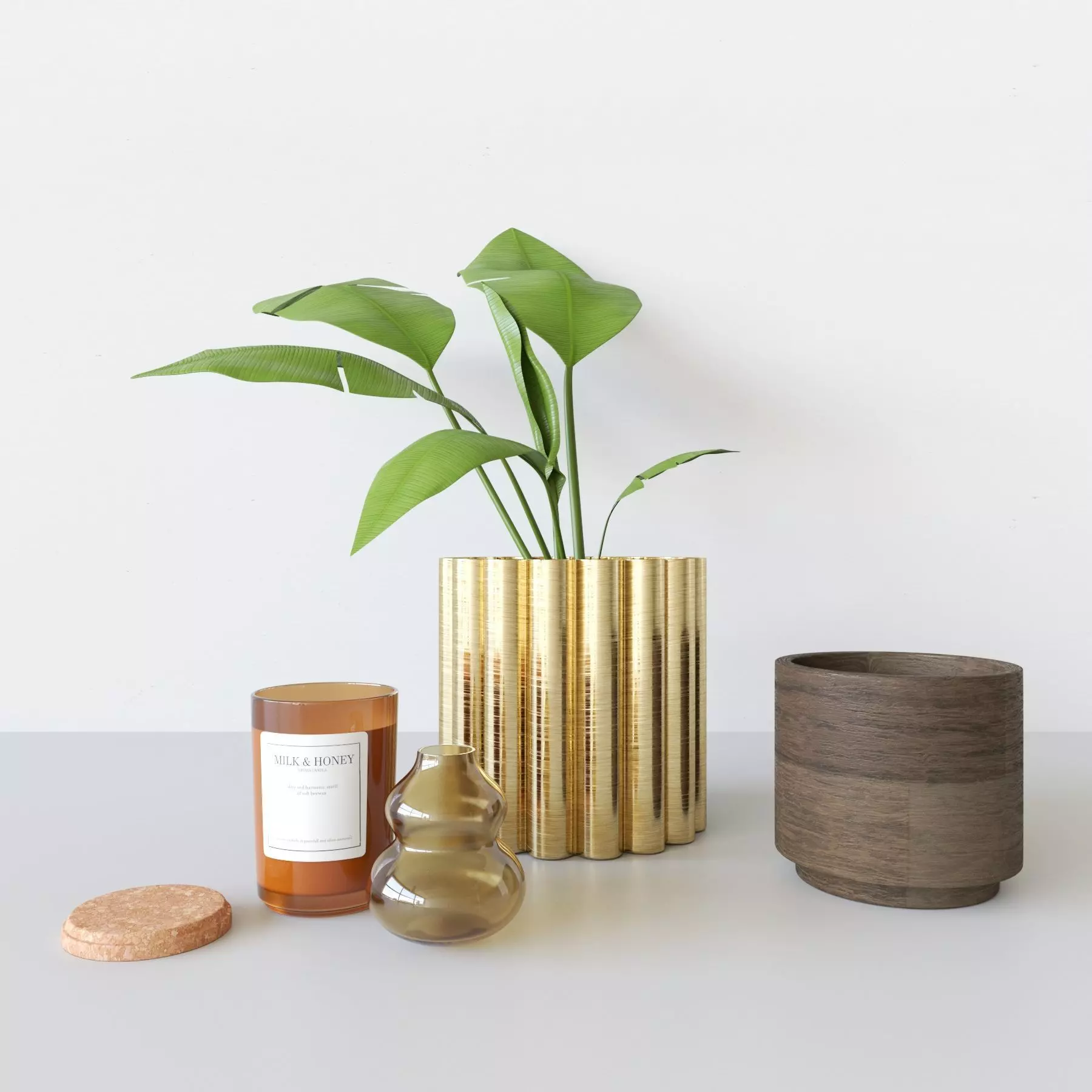 This is a realistic looking 3d model of a decorationset with a plant, vase, candle and bowl.
