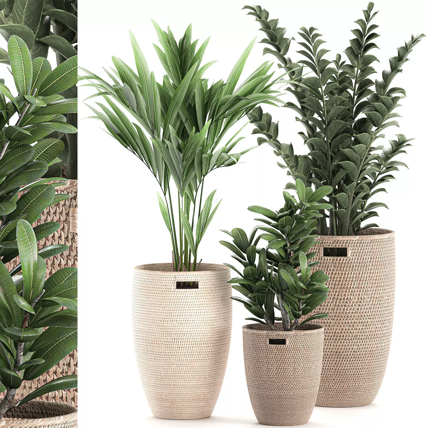 Decorative plants for the interior in baskets.Houseplantsexotic plantsTropical plantsHowea forsterianaDate palmTrees for the interior in a rattan basketfrangipaniplumeriaZamioculcaszamiifolia