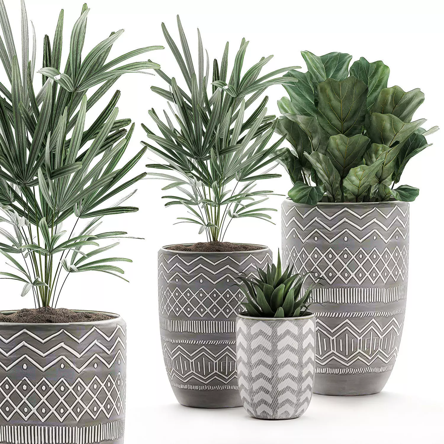 Decorative plants in pots for the interior.Houseplantsexotic plantsTropical plantsRhapis palmPottedFicus lyrataAgave