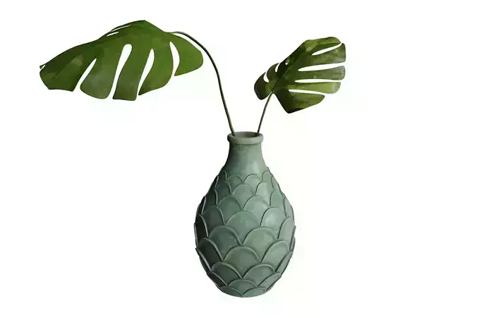 This is a detailed PBR (Physically Based Rendering) 3D model of a decorative vase holding two large Monstera deliciosa leaves. The vase features a unique, textured surface with a subtle, organic pattern and a stylish shape. The vibrant green Monstera leaves add a touch of tropical elegance. This model is perfect for interior design visualizations, home decor scenes, and adding natural elements to your projects.
