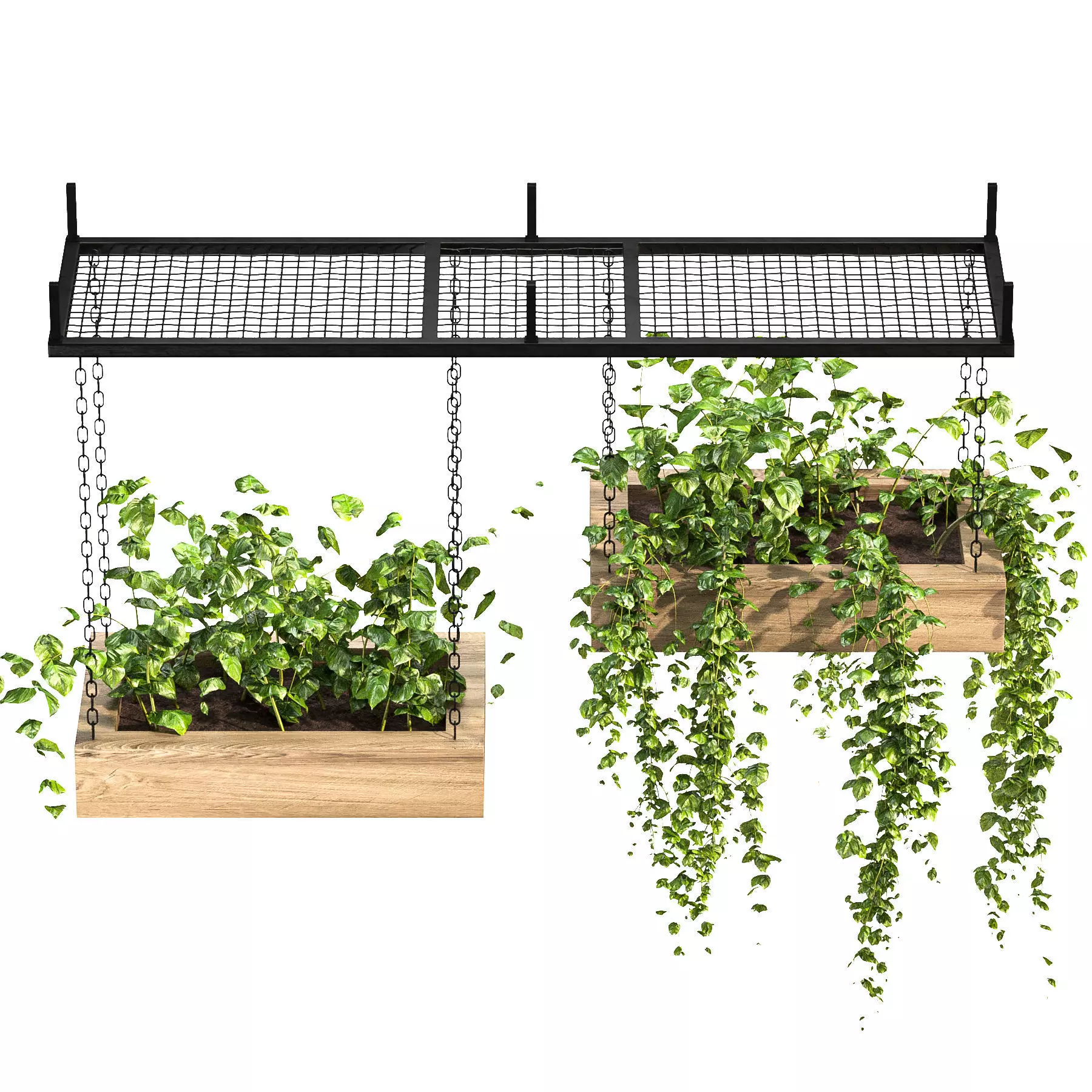 This model features a modern hanging planter system designed for ceiling-mounted interior greenery installations. It includes a black metal grid frame suspended by hooks, supporting two wooden planter boxes filled with detailed, lush foliage. One planter contains a compact, upright leaf arrangement, while the other showcases long, cascading vines that add a natural flowing effect.