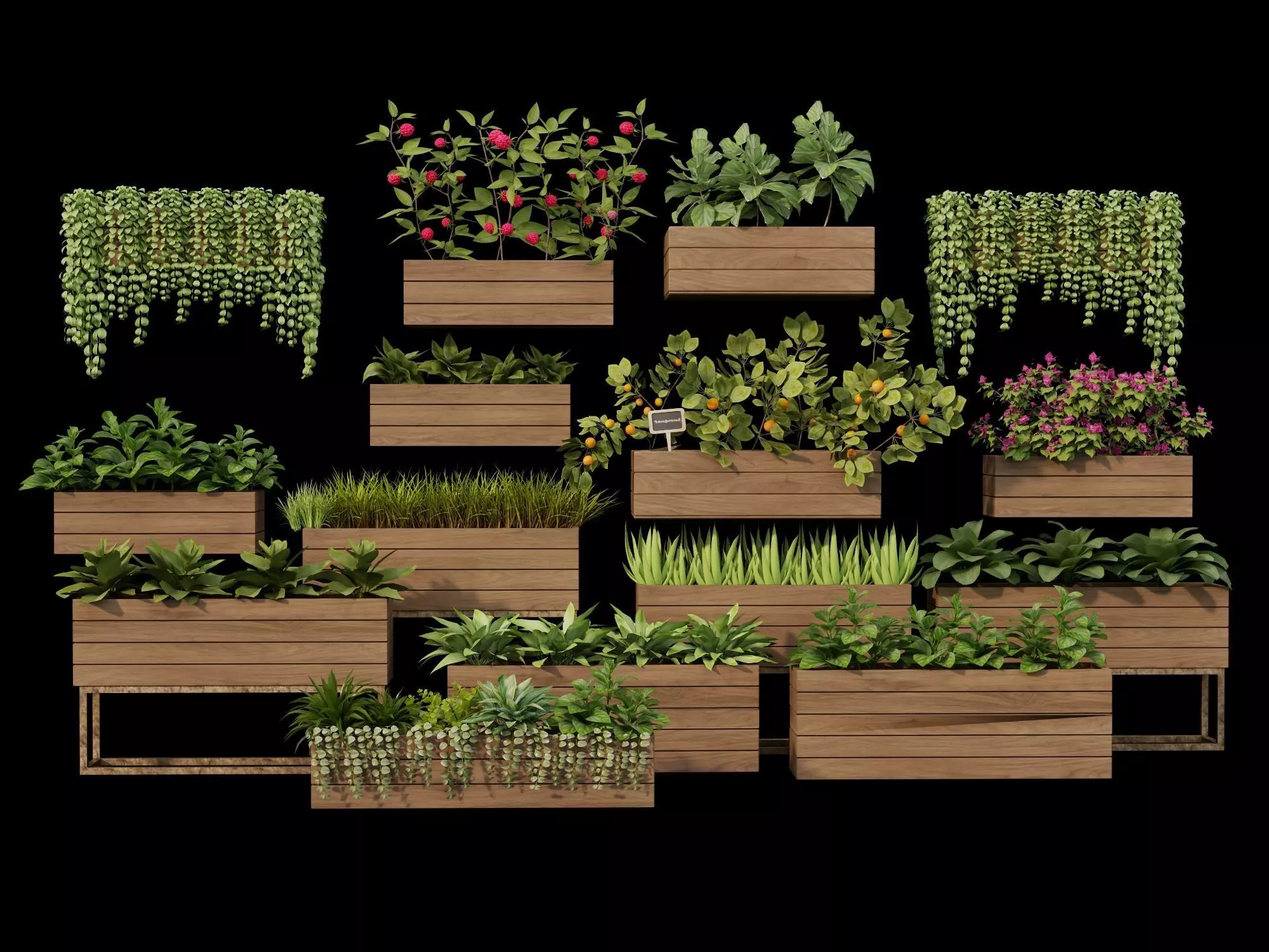 This series includes a variety of wooden planters in different sizes and layouts, paired with a range of realistic plants, such as leafy plants, hanging plants, herbs, flowering plants, and small fruit trees and shrubs.Each planter is modeled as an independent, reusable module, allowing for flexible placement and easy customization to suit different projects.