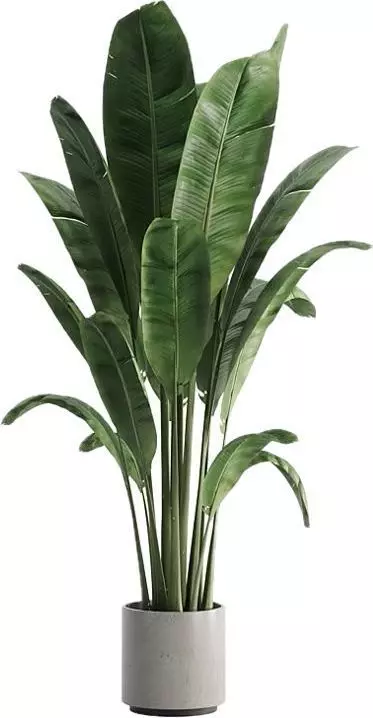 The model includes multiple high-resolution PBR materials with albedo, roughness, normal, and metallic maps that simulate the glossy surface of real banana leaves under various lighting conditions. The gray concrete-style pot is modeled with fine surface details such as texture grain and subtle imperfections, enhancing the overall authenticity and modern aesthetic. Both the plant and pot are optimized for high-quality rendering in Blender, Maya, 3ds Max, Cinema 4D, and other professional 3D software platforms.