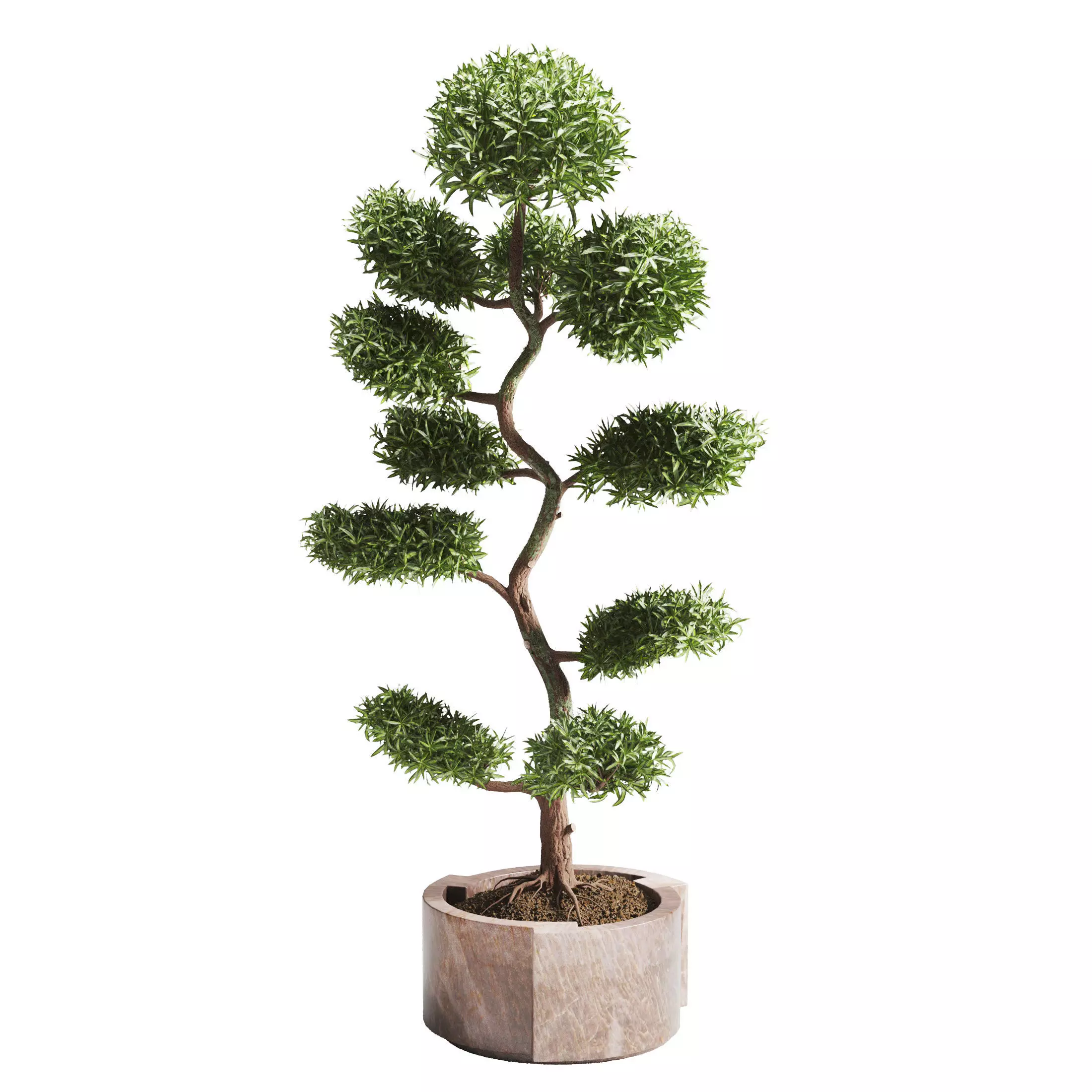 Introduce an elegant touch of tropical beauty to your 3D projects with this highly detailed 3D model of a tall bonsai tree. Modeled in 3ds Max and rendered using Vray and Corona, this piece showcases a perfect balance of natural realism and artistic flair. The intricate details of the tree's structure, from its lush, tropical foliage to the gracefully aged trunk, make it an eye-catching addition to any design.