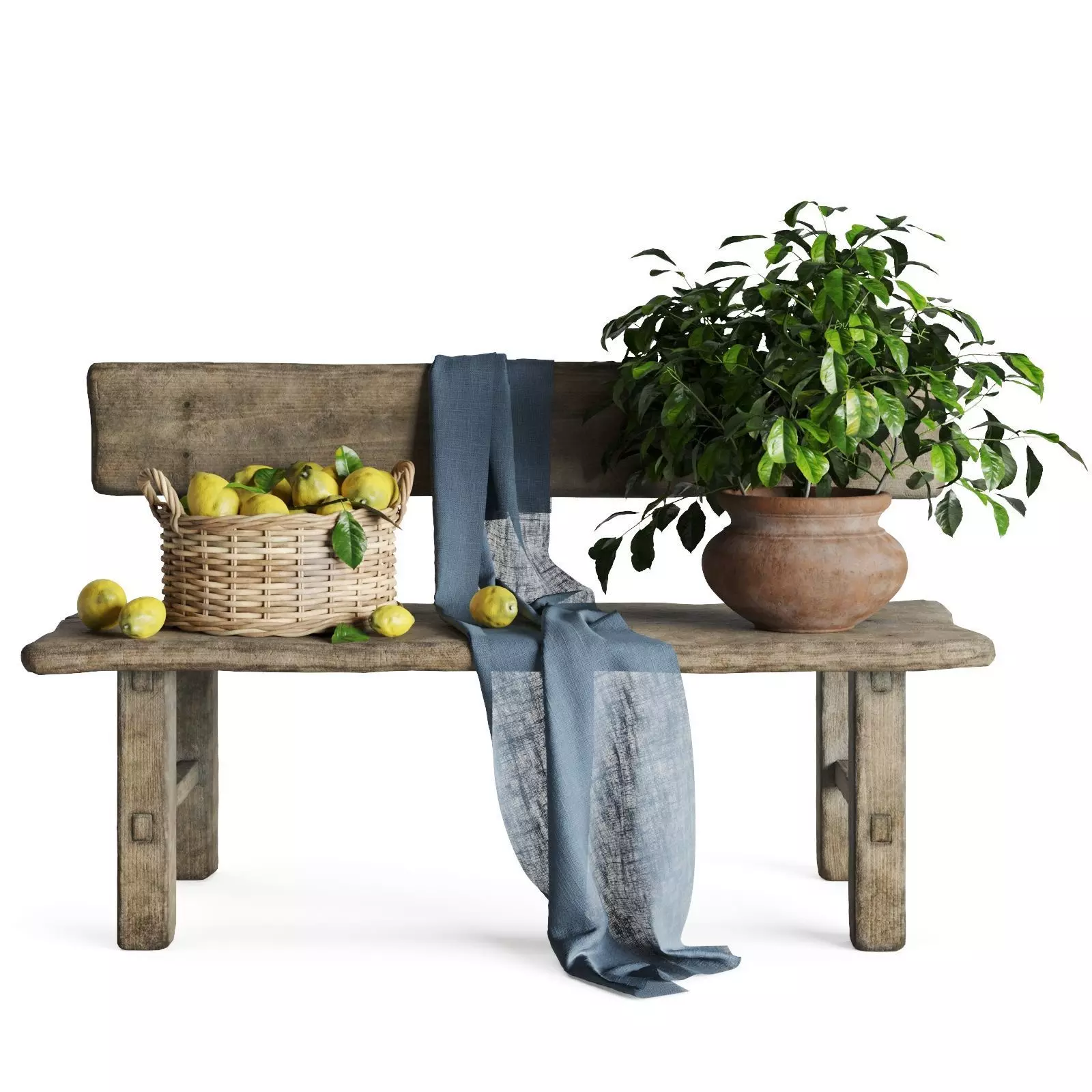 A rustic Mediterranean 3D set featuring a weathered wooden bench, a wicker basket filled with lemons, a clay pot with lush greenery, and a linen fabric draped over the seat. Each element is crafted with realistic materials, subtle imperfections, and natural warmth — perfect for cozy interior visualizations with a touch of countryside charm.