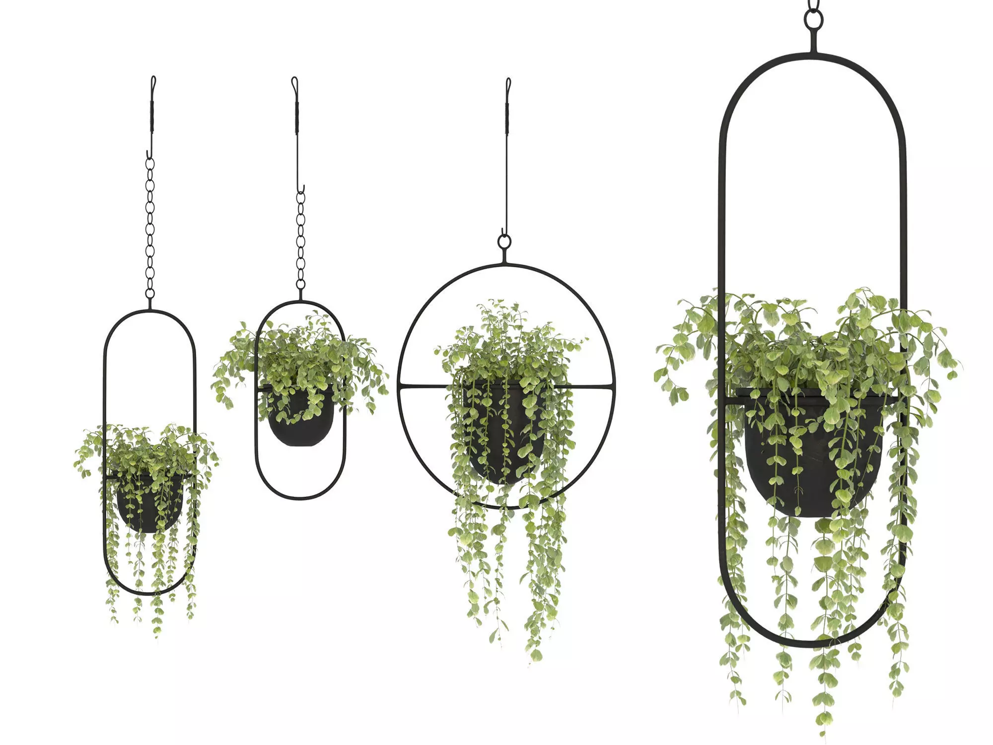Description:High-quality 3D model of decorative metal hanging plant holders with green cascading plants. The set includes 3 unique geometrical shapes (oval and round), each with black metal frames and realistic hanging greenery. Ideal for interior decoration scenes such as living rooms, balconies, or modern cafe designs.