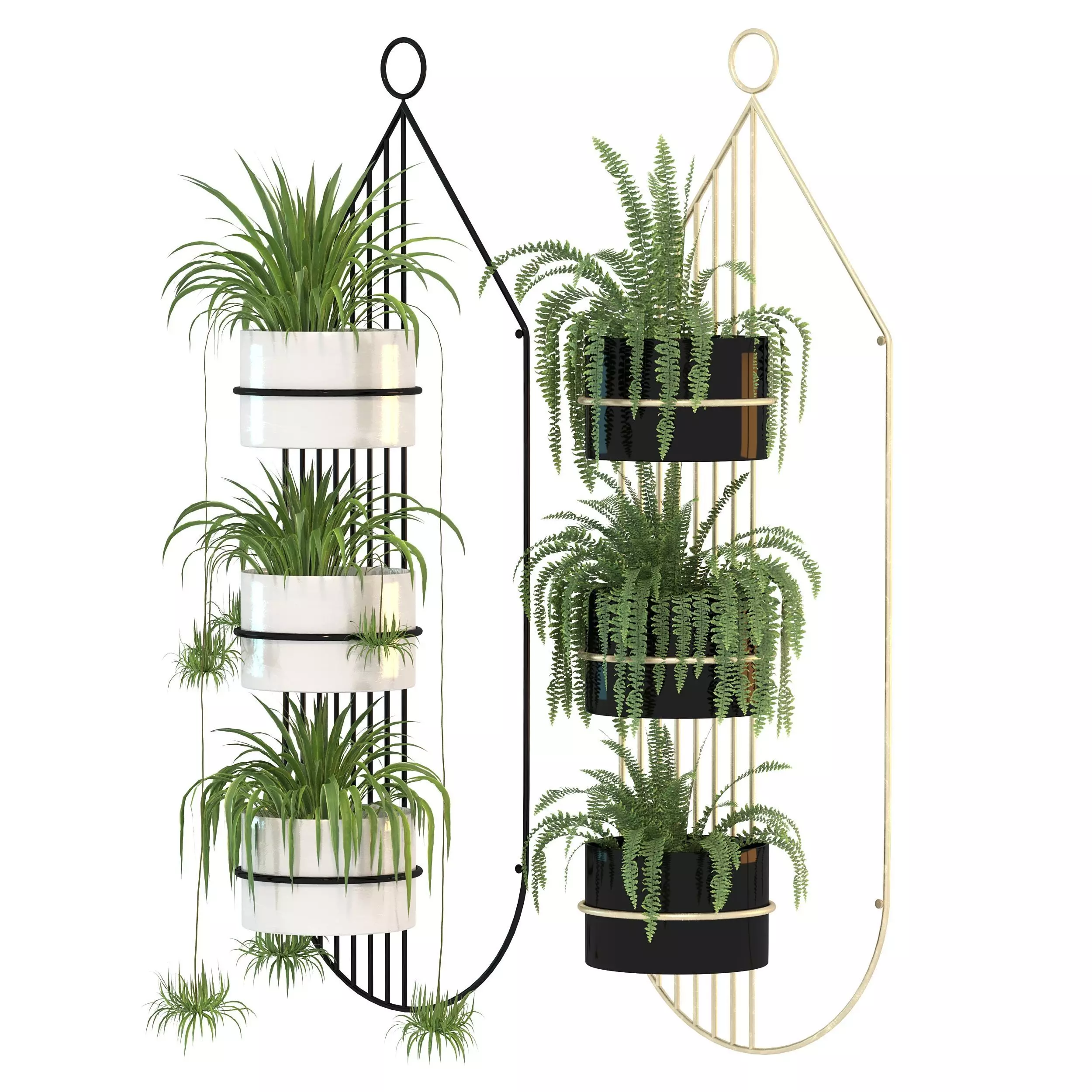 English Description (for 3dsky):Metal Plant Set 04 – A stylish decorative wall-mounted plant holder set featuring modern metal frames and realistic potted greenery. The set includes two vertical plant stands with elegant black and gold finishes, perfect for contemporary interiors. Each frame holds three pots with detailed foliage, making it suitable for living rooms, dining areas, offices, or any modern decorative environment. Optimized for both V-Ray and Corona render engines, provided in FBX and OBJ formats for maximum compatibility.