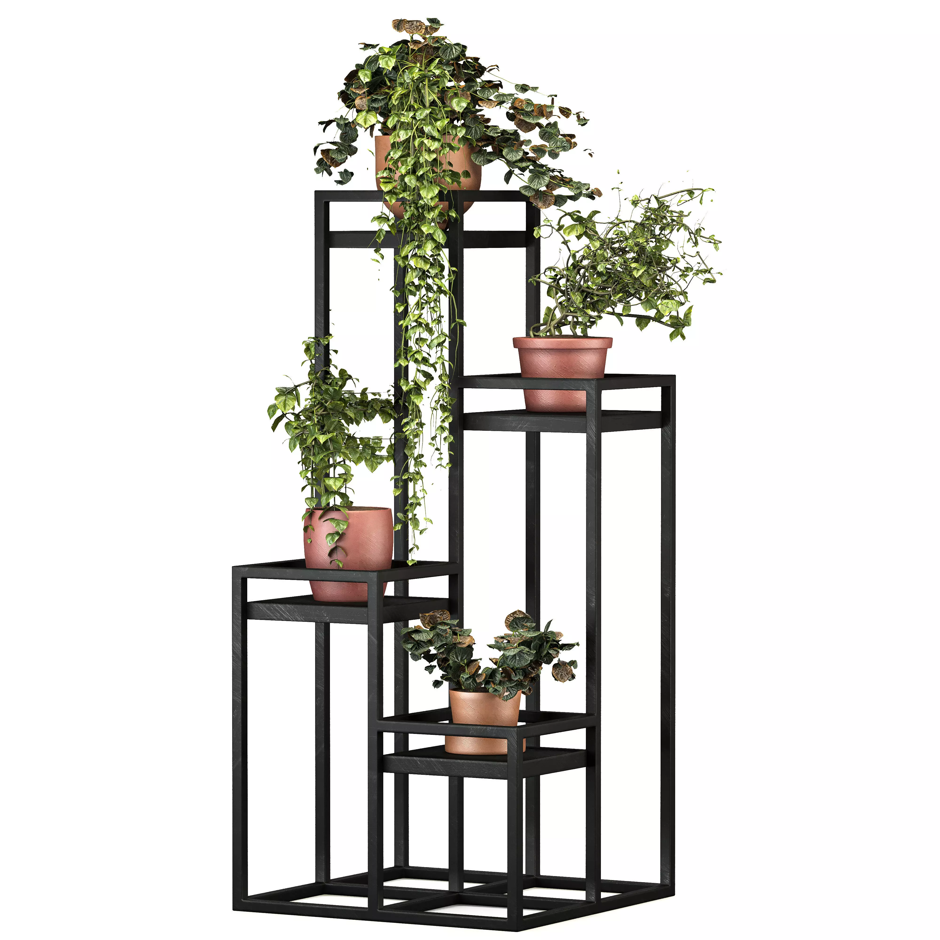 Metal Plant Set 14 is a modern decorative plant stand set designed for contemporary interior spaces.The model features a clean geometric metal frame with multiple height levels, allowing plants to be displayed in a visually balanced and dynamic composition.