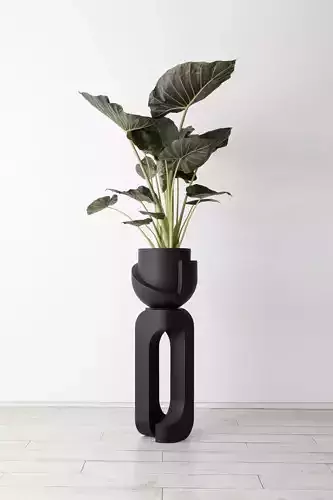 Download the striking 3D model of a modern plant stand, a bold fusion of functional design and sculptural artistry. This minimalist black planter 3D model features a sleek, geometric base with a unique oval cutout and a floating pot that creates an illusion of weightlessness. The tropical plant — likely a Alocasia or similar species — boasts large, dark green leaves with prominent veins, adding natural contrast to the clean, monochromatic structure. Perfect for use in interior design visualization, architectural renderings, product marketing, lifestyle content, and digital art, this plant stand 3D asset delivers contemporary elegance and visual impact.