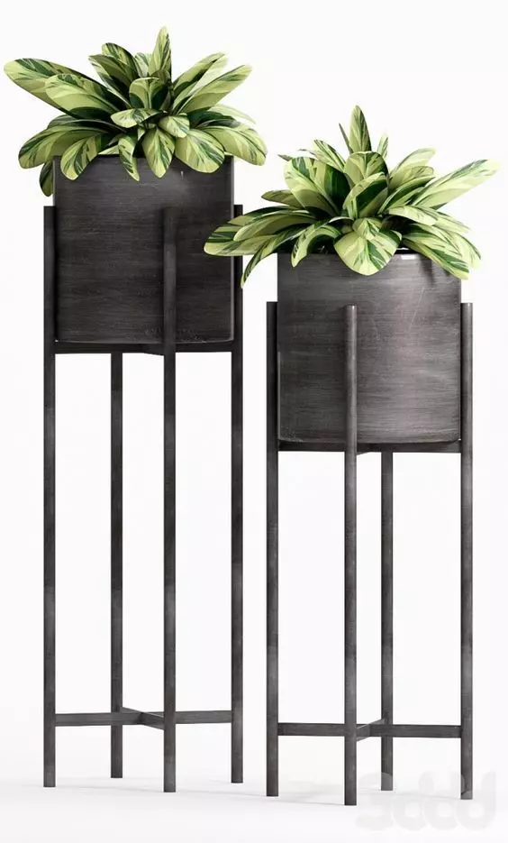 Download the sleek 3D model of modern plant stands, a minimalist and architectural design featuring two tall, black metal pedestal pots with vibrant variegated foliage. This indoor plant stand 3D model showcases a clean, industrial aesthetic with slender vertical legs and rectangular planter bases, creating an elegant visual contrast between structure and nature. The green plants — likely Aglaonema or similar variegated species — feature lush, patterned leaves in shades of green and cream, adding life and texture to the composition. Ideal for use in interior design visualization, architectural renderings, product marketing, lifestyle content, and digital art, this plant stand 3D asset delivers contemporary style and functional beauty.