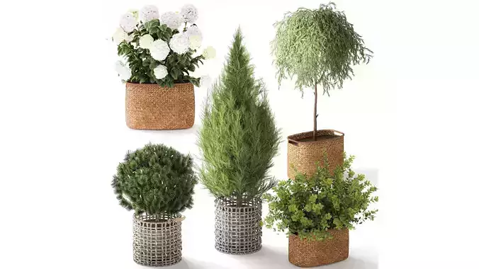 A collection of plants in wicker baskets featuring hydrangea, thuja, topiary, pine, and barberry bushes. Set 1510.Collection of indoor and indoor plants.Ornamental trees and shrubs, landscaping, urban environments, street landscaping, garden and home yard decoration, and parks.Plants, greenery, lawn, grass, garden, park area. Coniferous treesShrubs for outdoor use, public spaces, and decorationOrnamental grass for decoration. Garden shrubs,Urban environment elements, spaces, landscaping, local area, urban environment, street, square, parkJuniper - Juniperus, Juniperset, collectionBerberis thunbergii - Thunberg barberryNiwaki - Niwakigarden bonsaiSpruce, fir, fir-tree, fir, spruce, Picea, sprucegarden bonsai, topiary, topiary, pine, spruce, Pinus sabinaSilver oleaster - Elaeagnus commutataOliveHydrangea - HydrangeaHydrangea arborescensPink, white, green hydrangeaBasket, plants in baskets, flowers in a basket, basket, wicker basket, floristry, rattan, flowers in a basket, plant collection, plant set. Oval baskets from Zara Home, ZaraHome, Zara Home, Zara, Zarahome