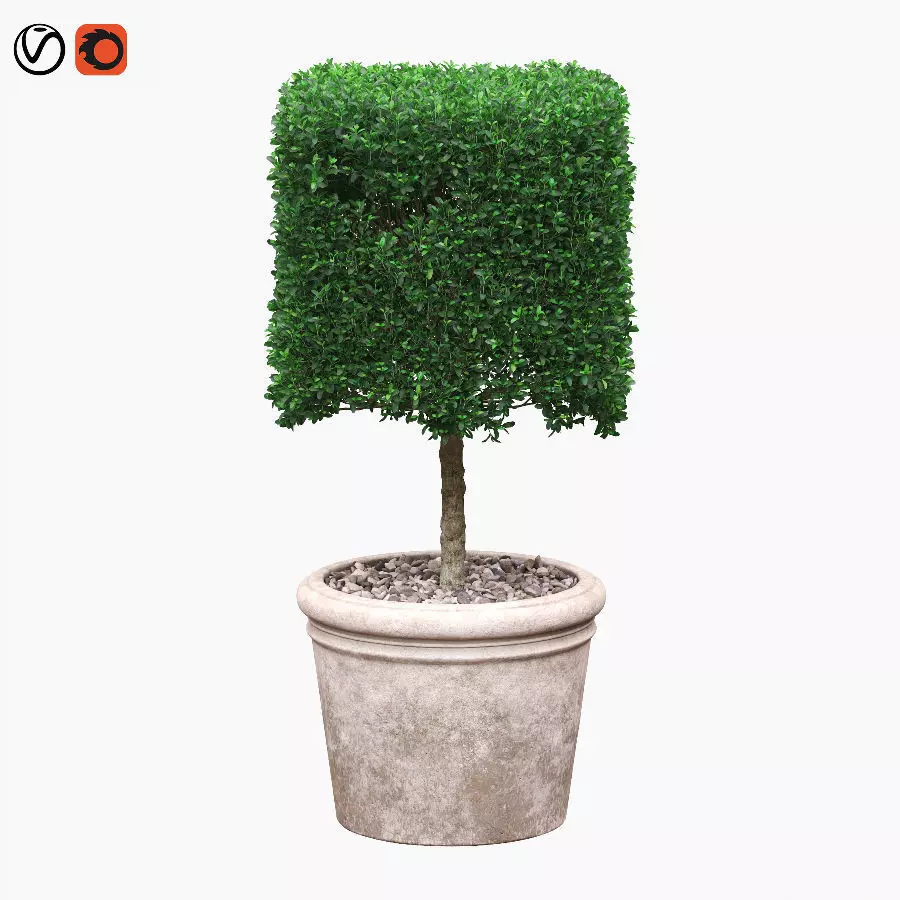 Potted topiary cube-shaped buxus (boxwood, european box, common box, buxus sempervirens, american boxwood, common boxwood) bush in ceramic pot with pebbles covering.Buxus is evergreen and very hardy and can be shaped into any form. For gardeners who enjoy ordered and very neat growth without having to do too much maintenance, this plant has become a favourite for containers, low hedges and other topiary.Pot made from white textured ceramics with pebble covering around the trunks.