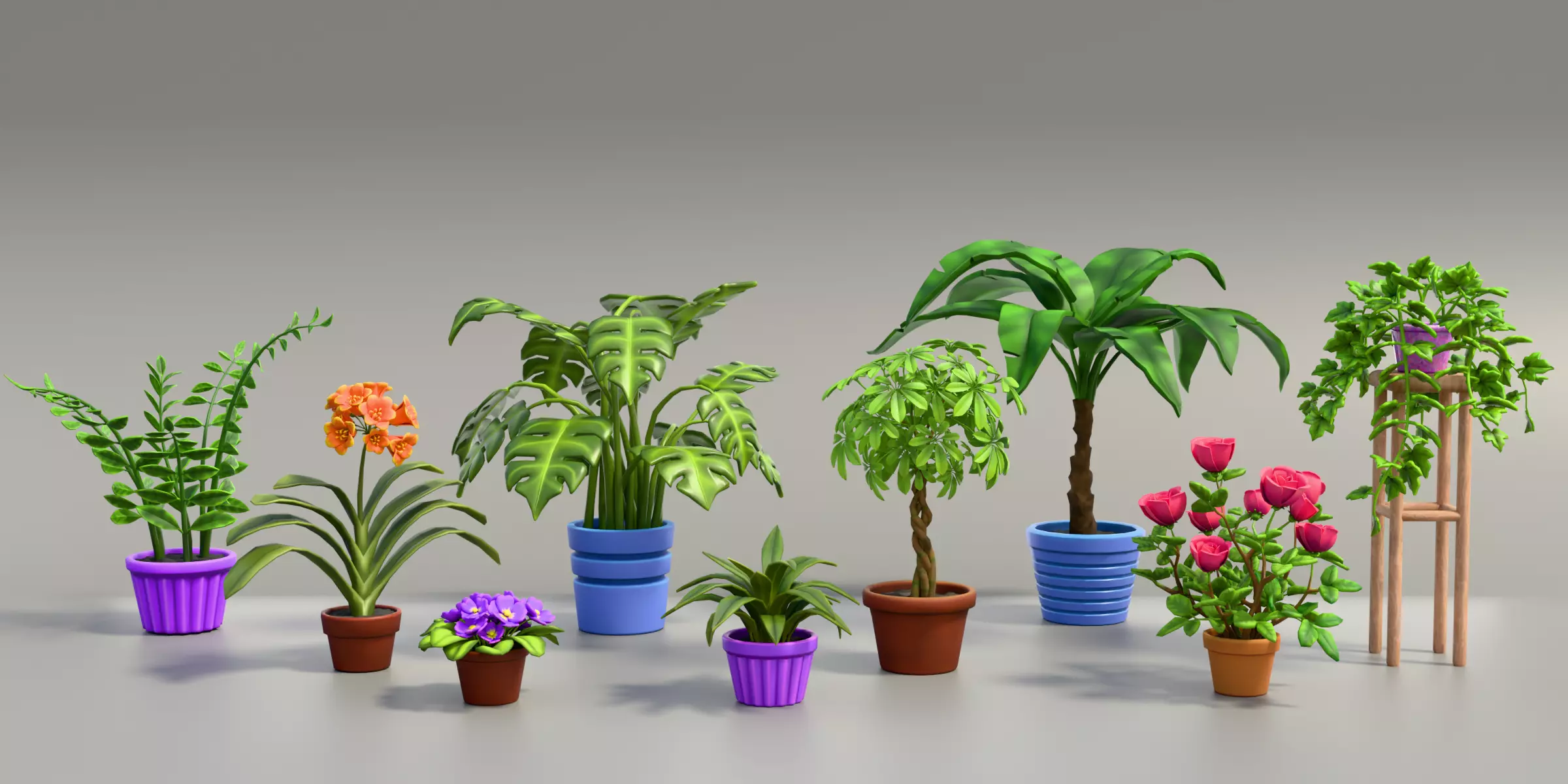 A stylized houseplant collection in flower pots, including monstera, palm, rose, violet, ivy on a flower stand and other plants (9 plants in total). Made in Blender 3D 4.3 (Cycles/Eevee materials).