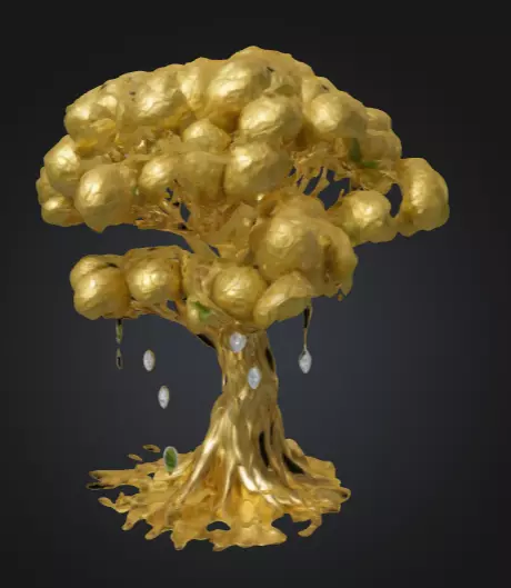 A majestic golden tree stands tall, its shimmering branches adorned with radiant diamond fruits that glisten like stars, casting a mesmerizing glow, enchanting all who behold its ethereal beauty.