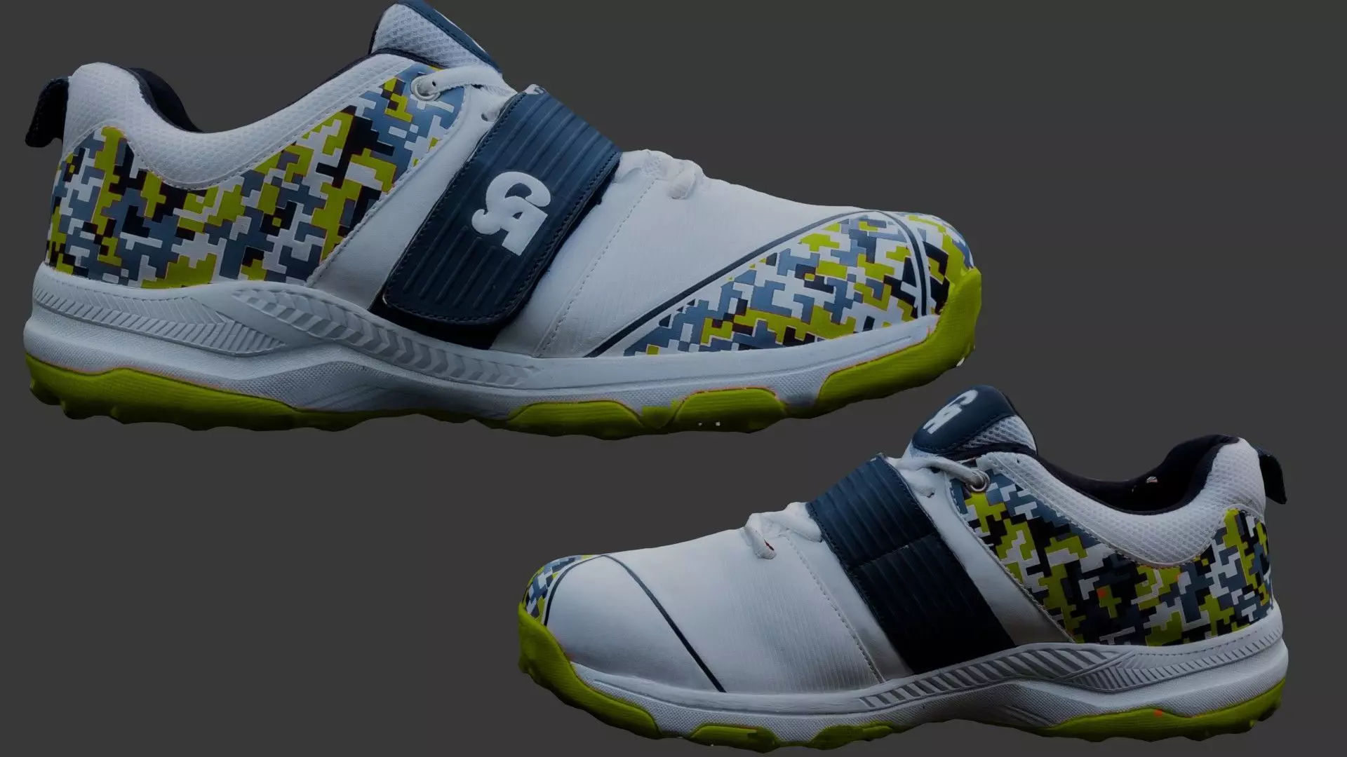 High-quality 3D scan of a modern sports shoe, featuring a stylish digital camouflage pattern in blue, yellow, and gray tones. This athletic sneaker is designed with a Velcro strap and lace-up combination, offering a secure and adjustable fit. The textured sole ensures grip and durability, making it ideal for sports, casual wear, or digital fashion projects.