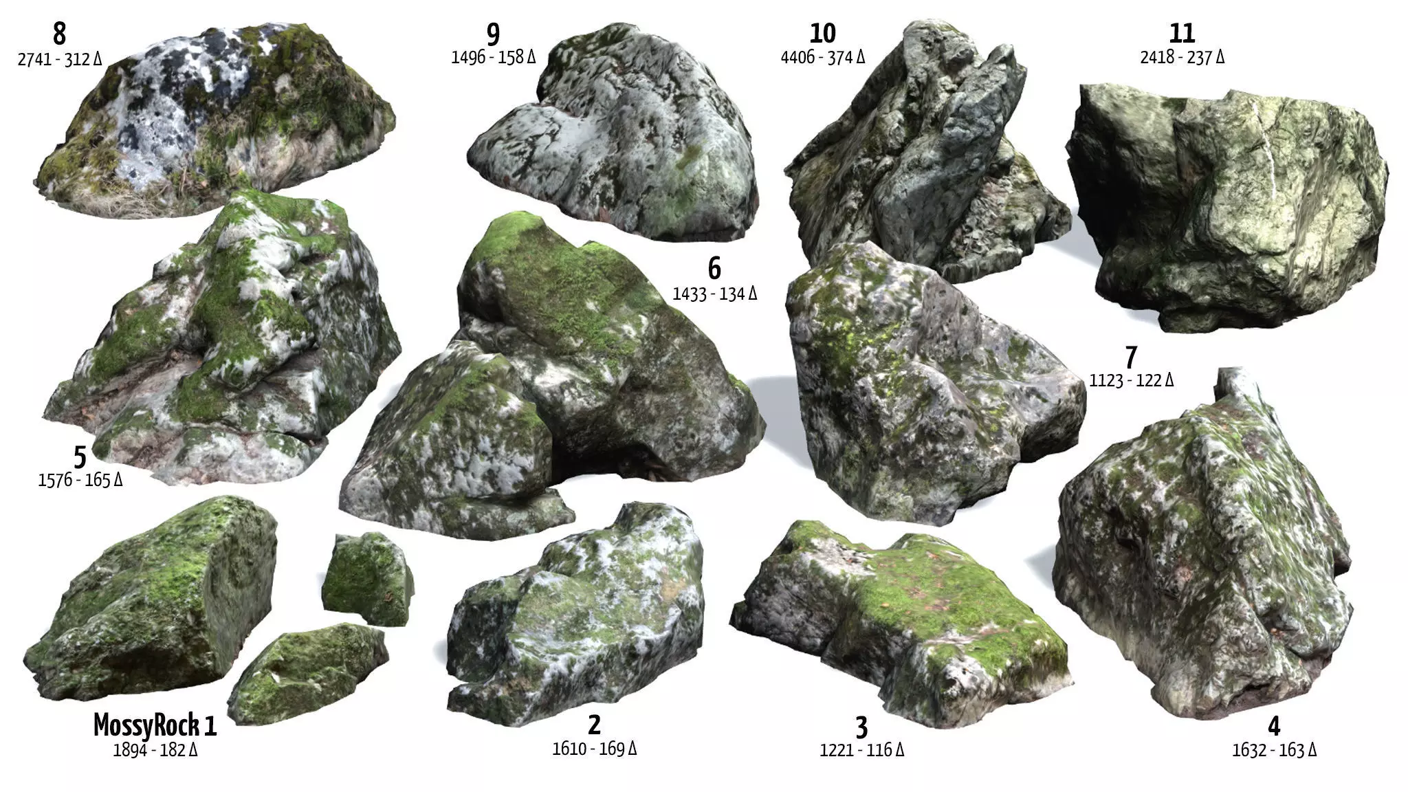 These 11 rock models share the same 3 materials (Mossy rock 1,2,3 & Mossy rock 4,5,6,7 & Mossy rock 8,9,10,110) -> meaning fewer draw calls & better GPU performance when your scenes are populated with many models.Thanks to the LOD system, and mipmaps to optimise the huge resolution textures, you can use these models as game assets and still have great frame rates.