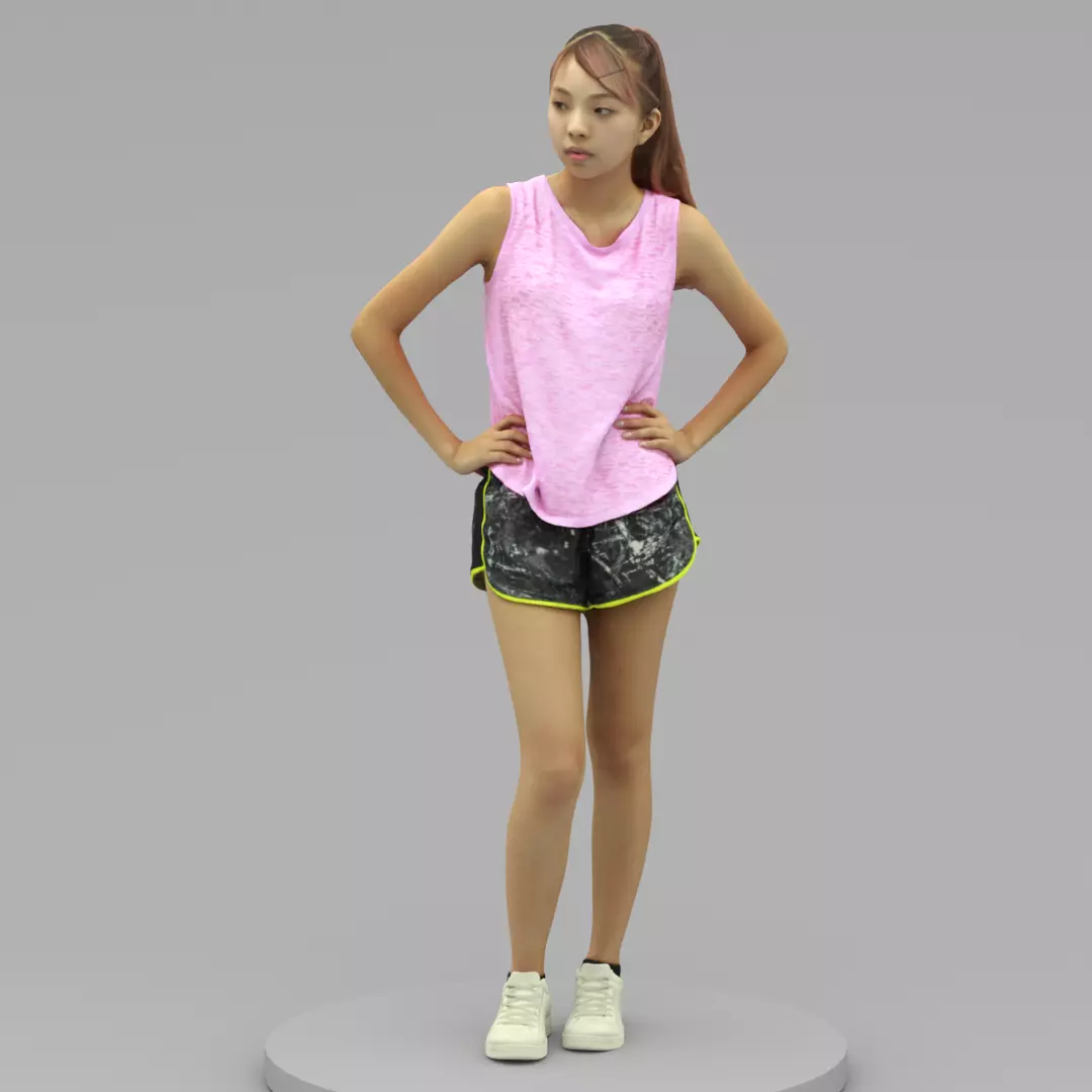 A cool young woman posing in akimbo postureA cool young woman lady puts hands-on the waist in a pink t-shirt and shorts