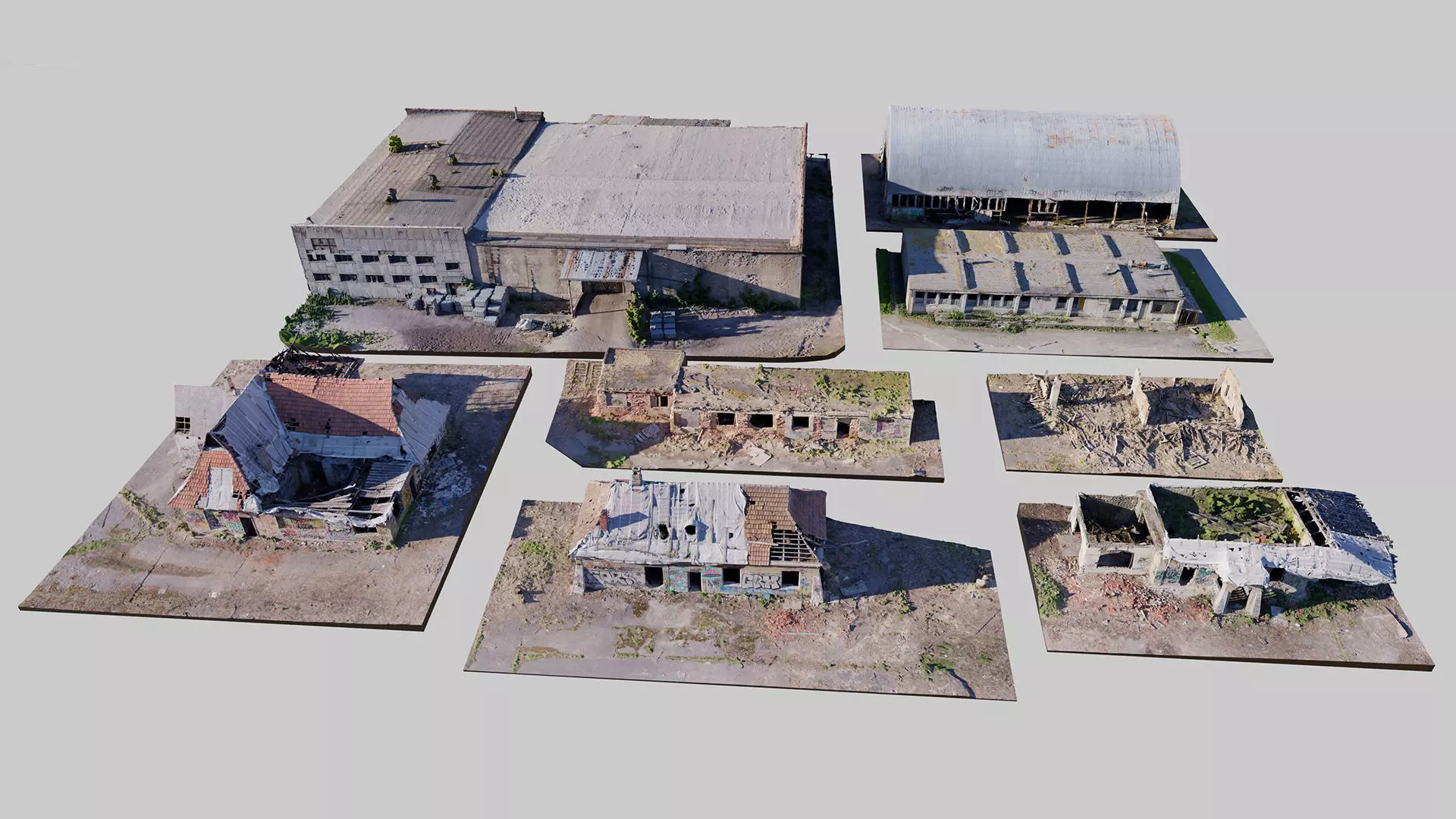 A set of abandoned soviet base buildings. This set has 8 buildings, each has 2 LODS - low poly set is about 2M polys and HD version set is about 20M polys and it works well for closeups. The set is prepared as .blend, .obj or .fbx with all buildings in one file as well as separated so you can open it one by one.