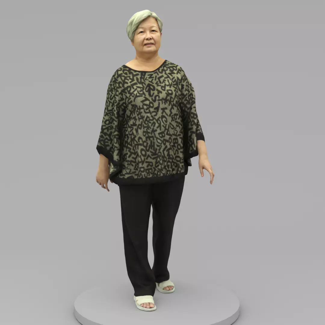 An old lady walking to somewhere wearing flower pattern blouse and black trousers.