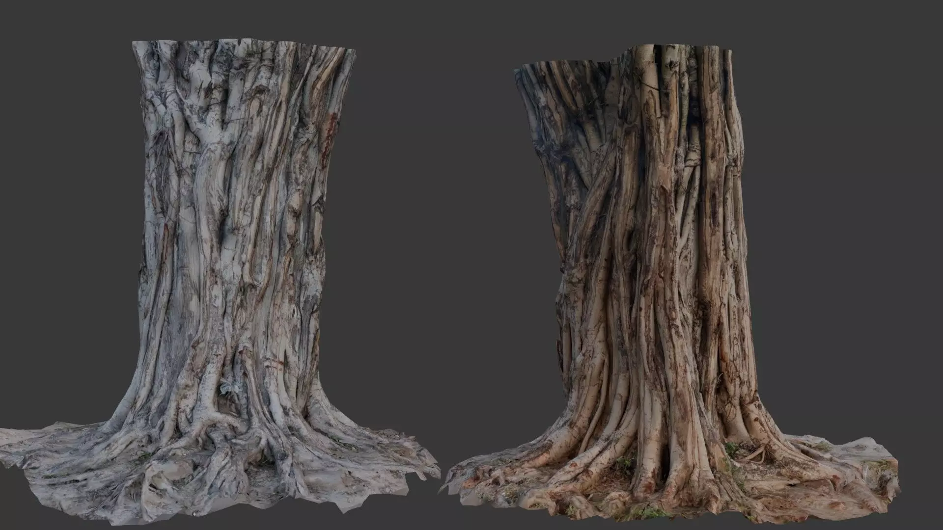 Highly detailed 3D scan of an ancient tree trunk with intricate roots and a textured bark surface. This realistic asset is ideal for use in games, animations, architectural visualizations, and nature-based scenes. The scan captures every detail, making it perfect for photorealistic rendering and real-time applications.