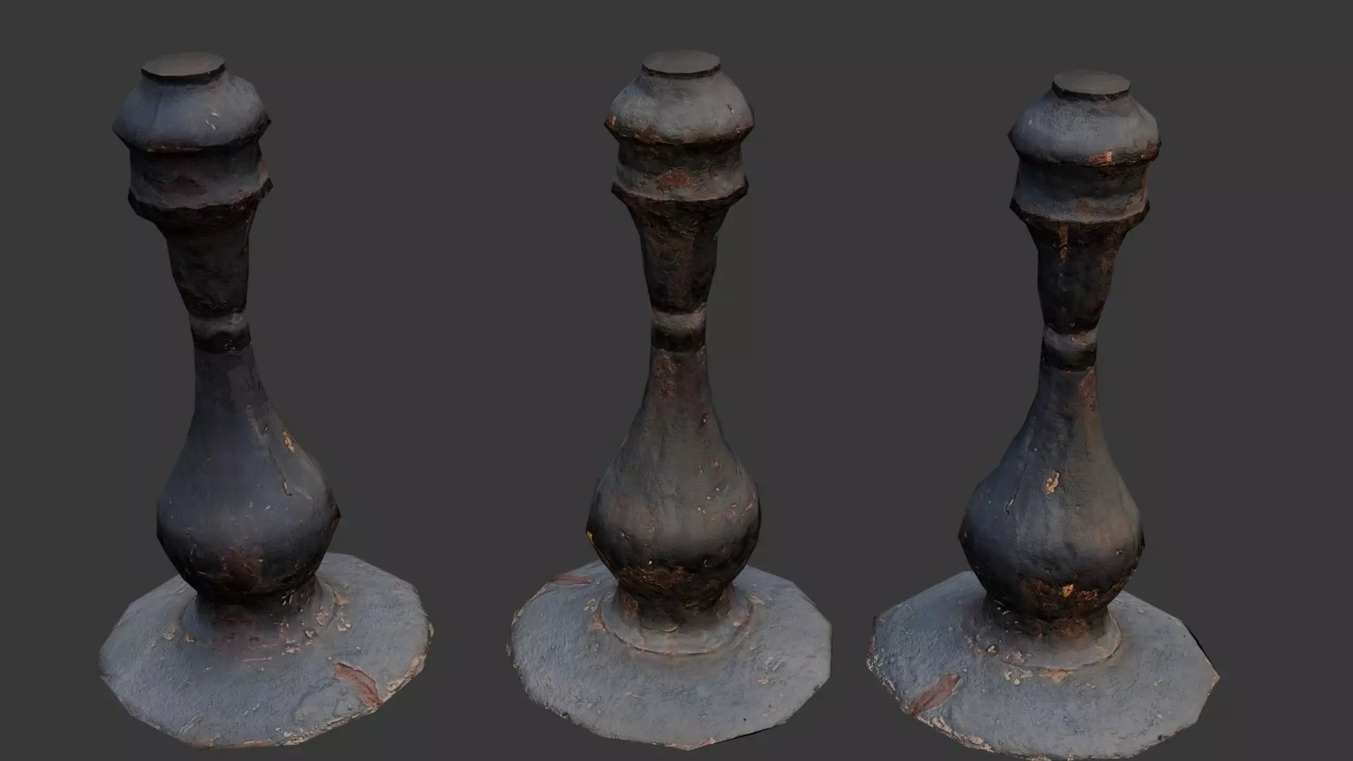 A highly detailed 3D scan of an antique cast iron baluster with realistic rust, chipped paint, and weathered details. This model is perfect for use in historical reconstructions, architectural visualization, games, and cinematic environments.