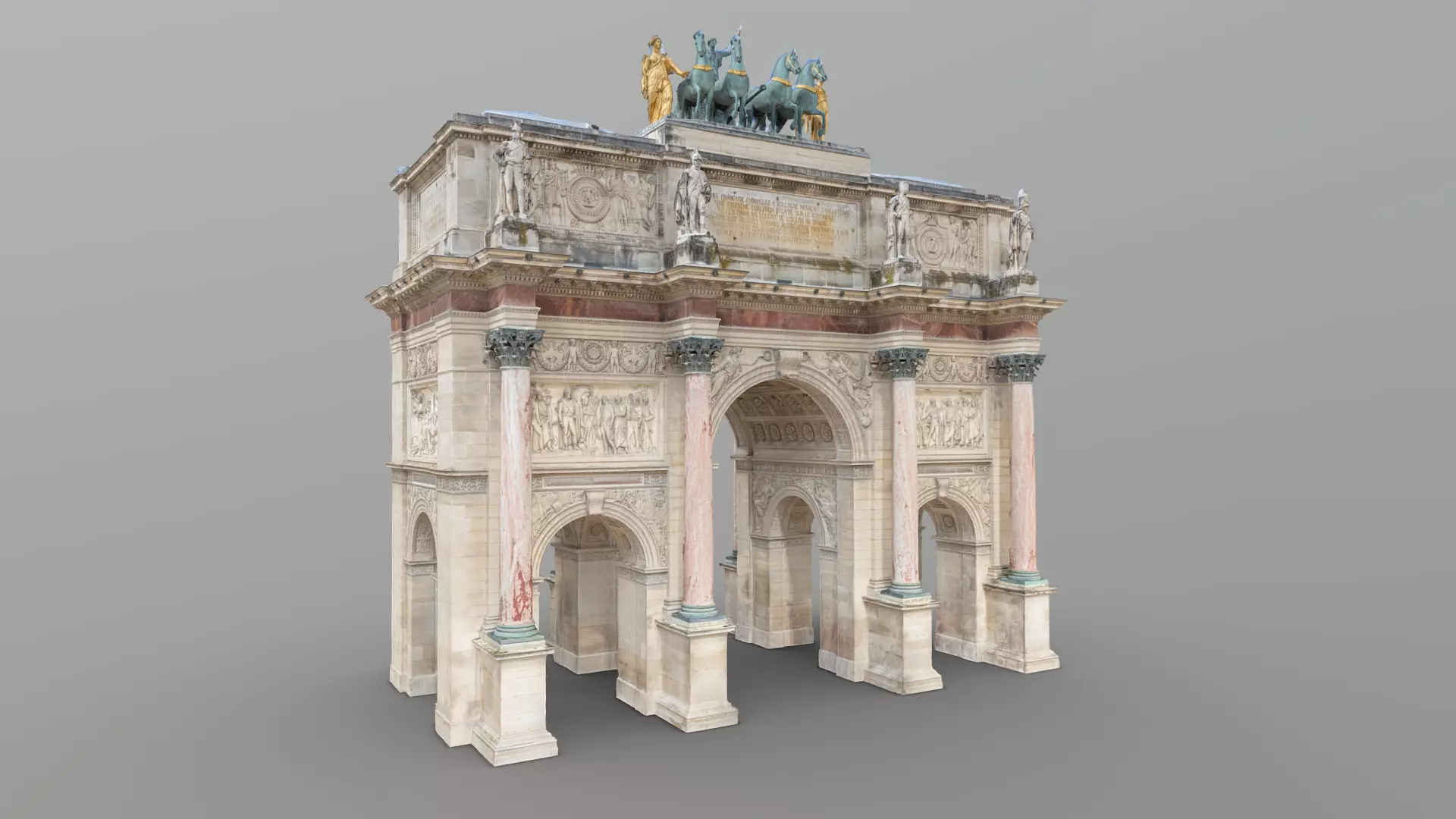 High poly photogrammetry model of the Arc de Triomphe du Carrousel in Paris. It was built between 1806 and 1808 to commemorate Napoleon’s military victories in the Wars of the Third and Fourth Coalitions (source: wikipedia). It is located near the Louvre Pyramid in the place du Carrousel.