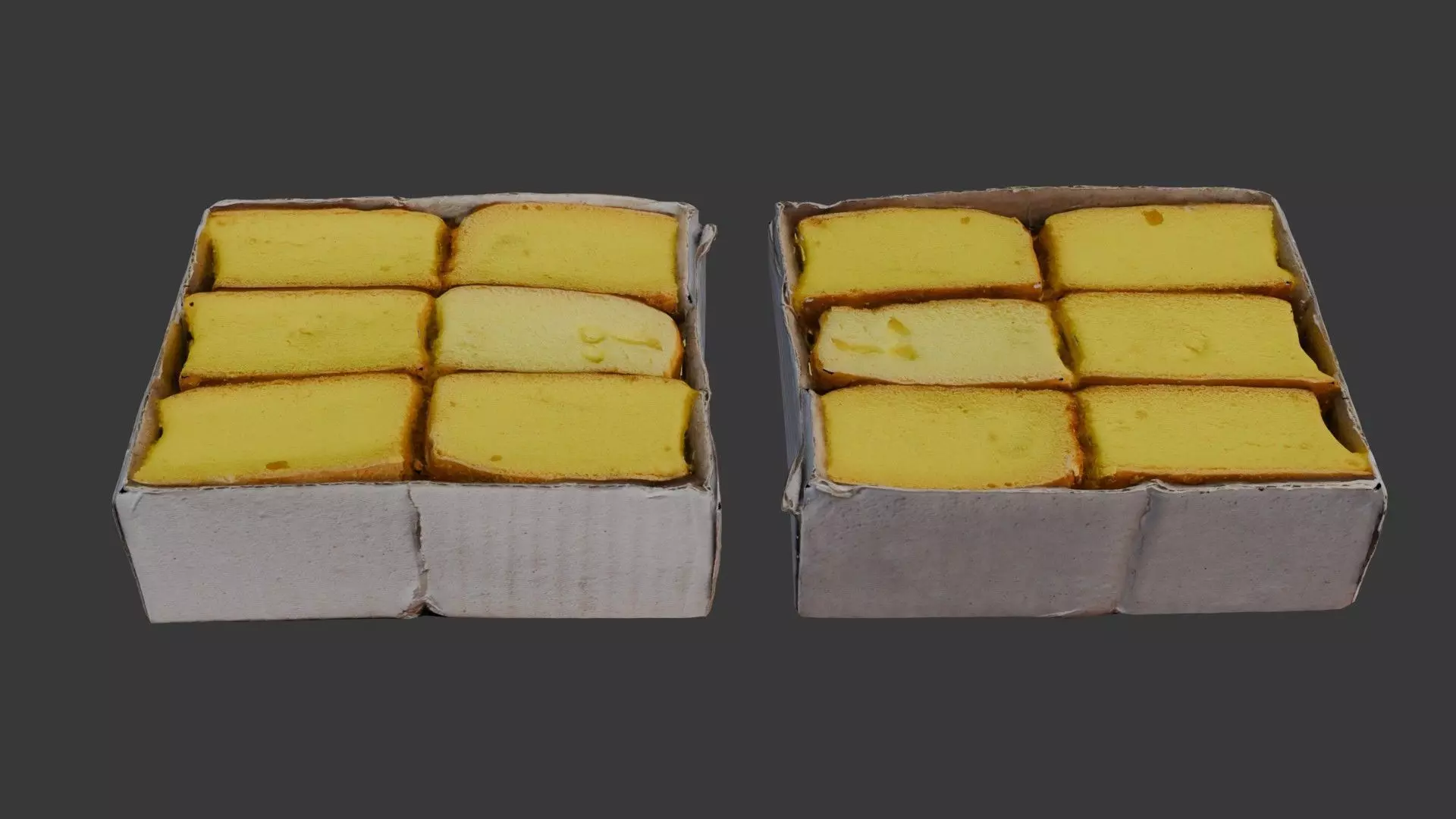Highly detailed 3D scan of a box filled with sliced sponge cakes, featuring realistic textures, soft cake surfaces, and a slightly worn cardboard container. Ideal for food-related scenes, game assets, virtual restaurants, product visualization, or CG projects requiring an authentic bakery item.