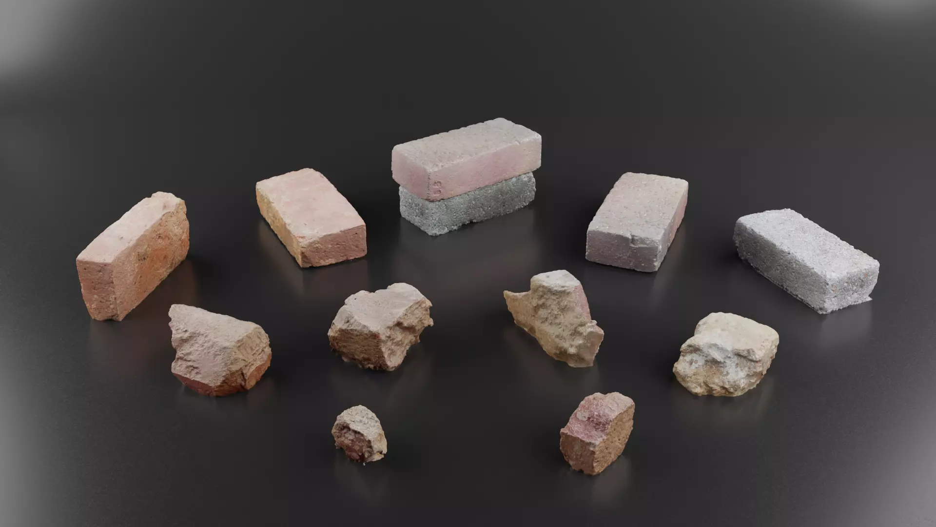 About the modelsThis set includes three variants of eleven different chunks of brick rubble. Raw scans, a high poly set, and a low poly set. The low poly variants are all quad topology, while the high poly and raw scans are triangulated. The low and high poly sets utilize a 2K PBR texture set per object, while the raw scans are 4K. The largest and most dense model ranges from 1.25M vertexes in raw form, 63K as high poly, down to 428 in it's low poly version. **A little more detail.**The files you will be downloading are OBJ files, as well as .blend versions including all diffuse, normal, and roughness maps.