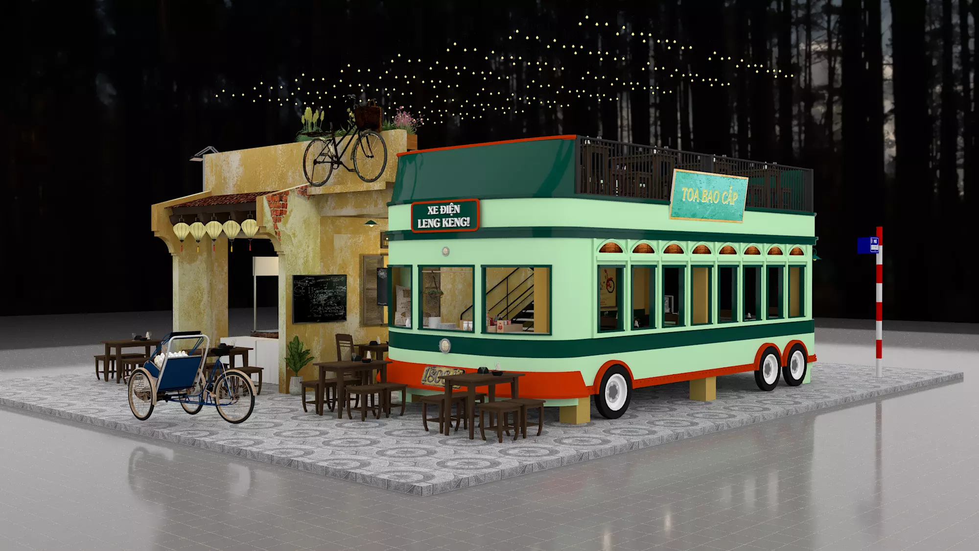 This restaurant design is a captivating fusion of nostalgic Old Hanoi aesthetics and creative modern architecture, centered around the iconic Leng Keng tram. The centerpiece is a stylized double-decker tram featuring a vintage seafoam green and red color palette, with the upper deck ingeniously repurposed into an open-air dining terrace.