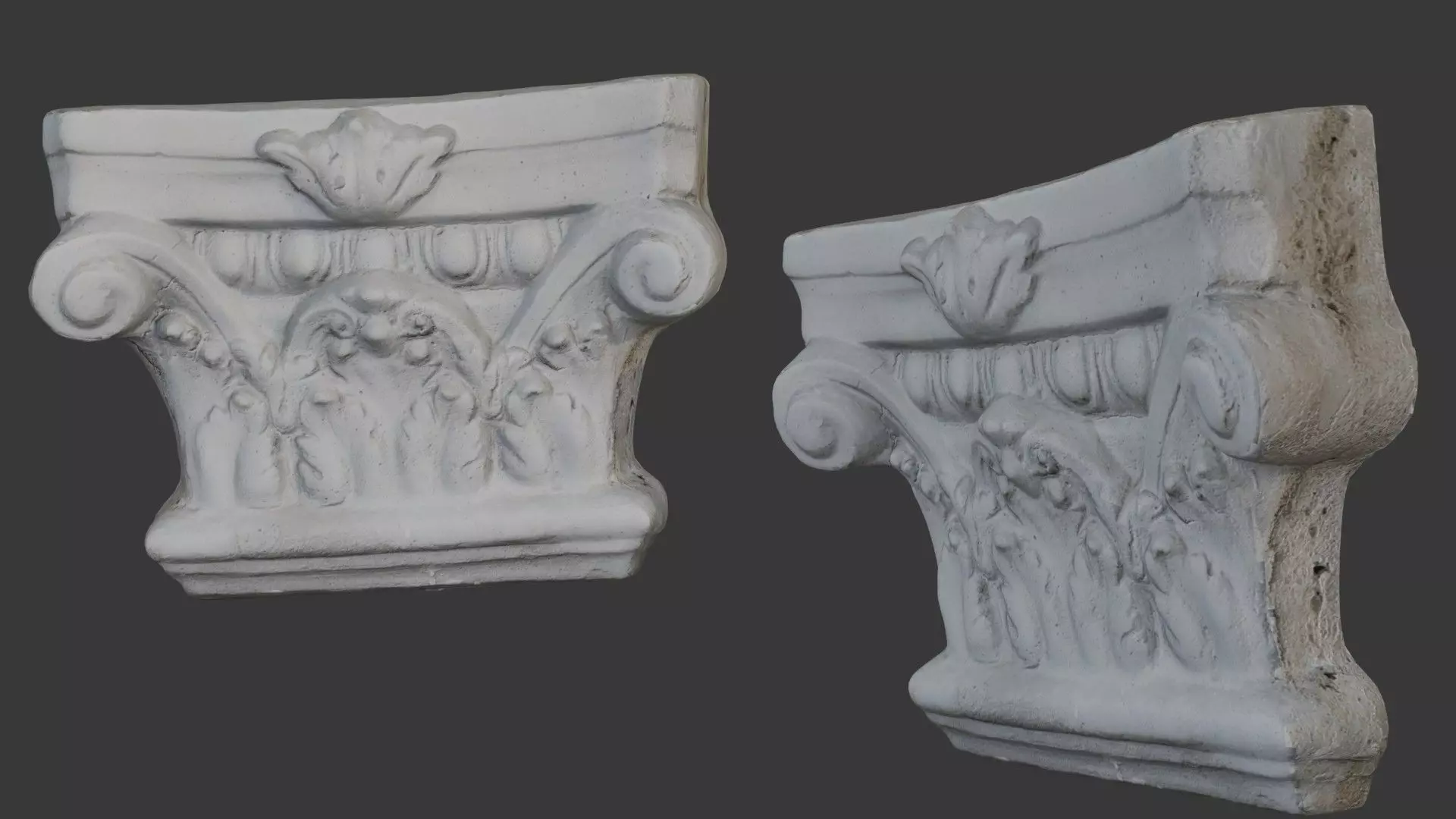 High-resolution 3D scan of a classical ornamental capital, featuring intricate floral and scrollwork details. This decorative architectural element is perfect for historical reconstructions, architectural visualization, game environments, and CGI projects. The model captures realistic textures, wear, and material imperfections for an authentic look.