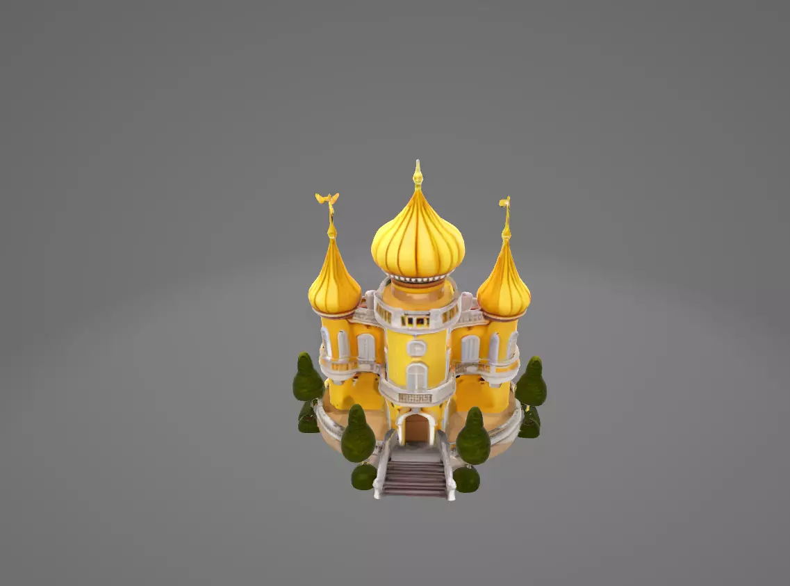 A 3D model of a bright yellow castle with golden domes, surrounded by greenery and decorative steps leading to the entrance.