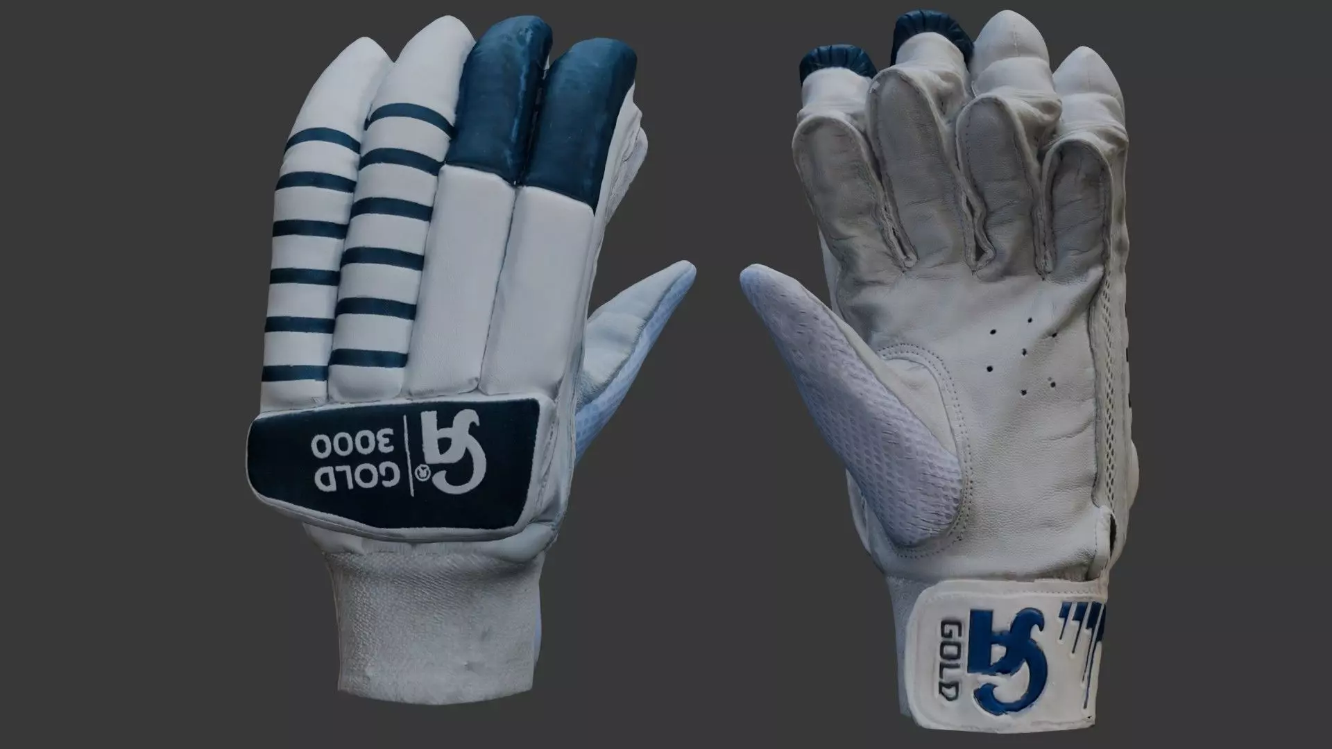 High-quality 3D scan of SG Gold 3000 cricket batting gloves, featuring a realistic worn leather texture, ventilated palm design, and reinforced finger protection. The gloves showcase game-used details, making them ideal for sports simulations, VR/AR experiences, and product visualizations.