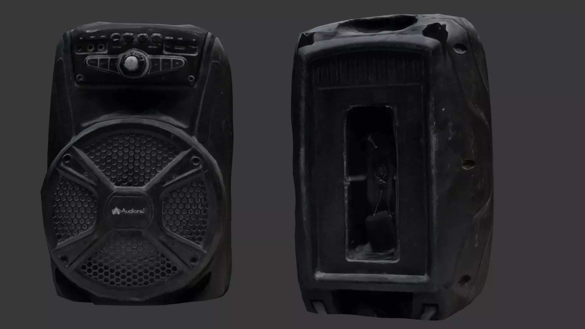 High-quality 3D scan of a heavily damaged portable speaker, featuring realistic wear, cracks, dents, and missing components. The speaker's structure is warped, with visible internal damage, making it a perfect asset for post-apocalyptic environments, urban decay scenes, or abandoned interiors.