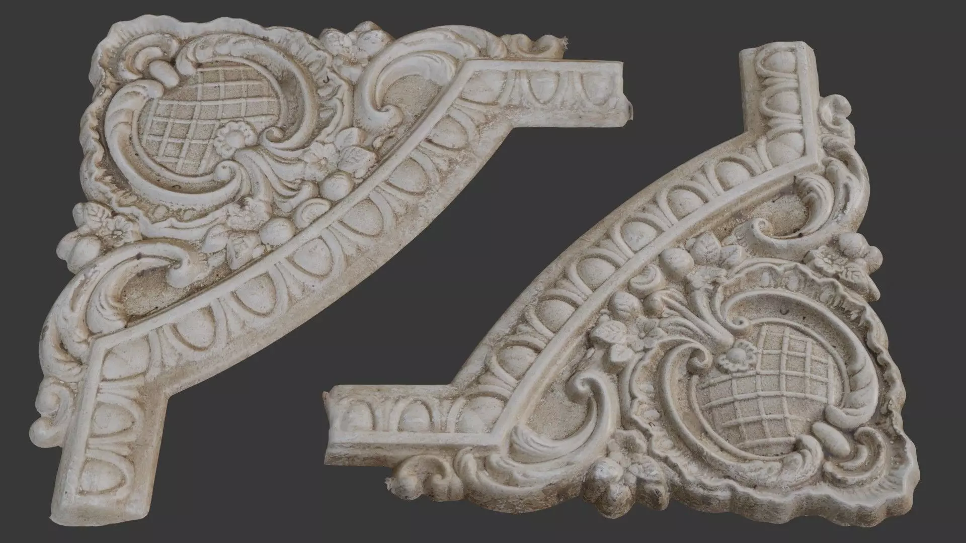 Highly detailed 3D scan of an ornate architectural arch corner, featuring classical patterns, floral motifs, and a central textured medallion. Ideal for historical building restorations, decorative interior accents, or as an elaborate prop in grand scenes. The model is provided in multiple formats (BLEND, FBX, OBJ, GLB, USD, STL) and includes 4K PBR textures for seamless integration in any pipeline.