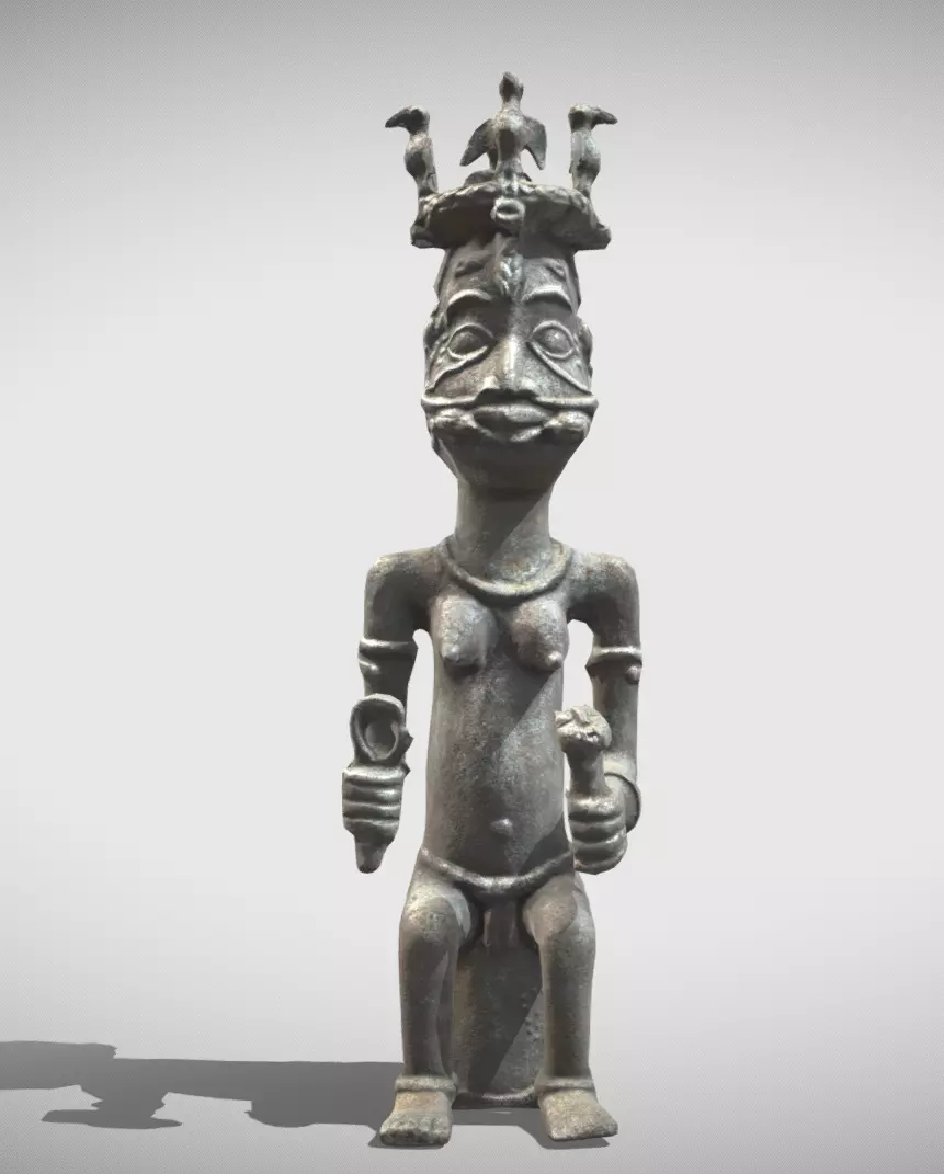 The top of the statue features an altar head with two faces, representing Osun, the deity of fertility, love, and water in the Yoruba and Edo traditions.The double faces might symbolize duality, balance, or the multifaceted nature of the deity.The main body of the figure is a feminine form with prominent breasts, emphasizing fertility and motherhood.The statue is holding objects in both hands. One of these objects has a face resembling a leopard, an animal symbolizing power, royalty, and cunning in Benin culture.