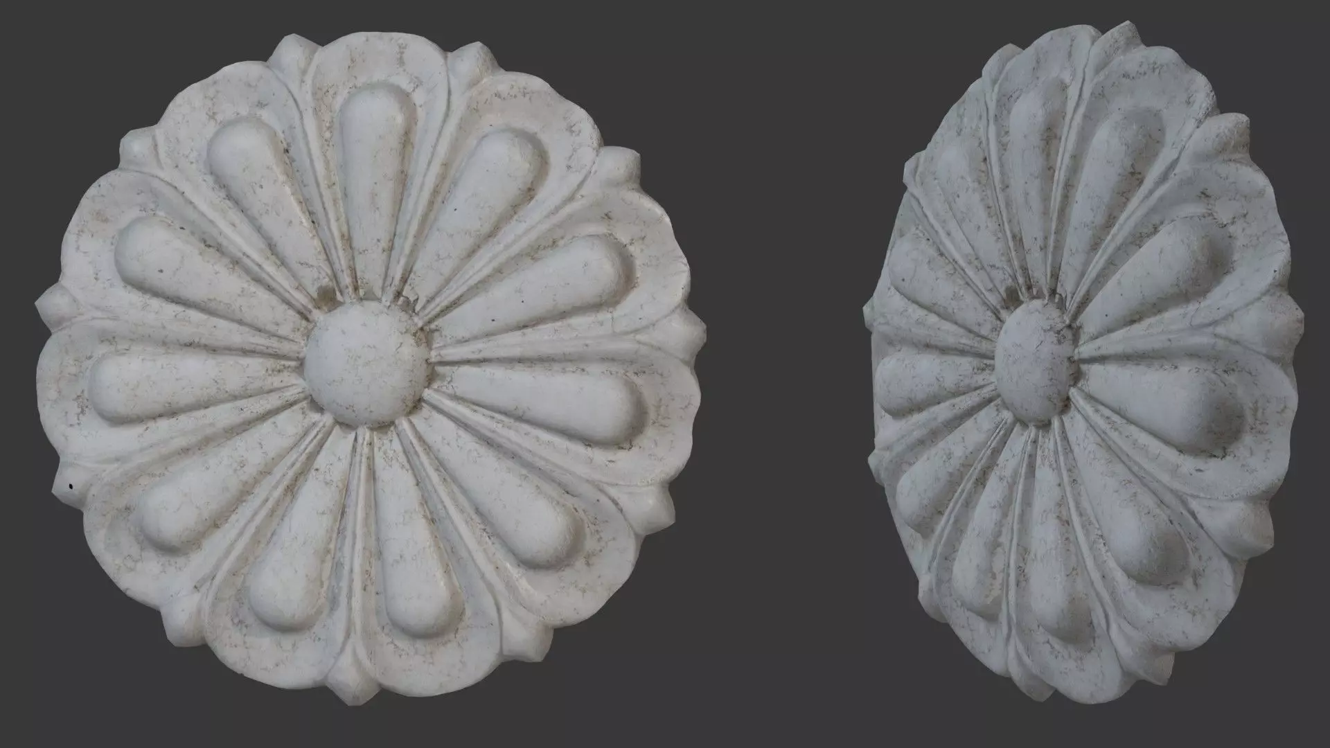 Highly detailed 3D scan of a classic floral rosette ornament, perfect for architectural detailing, historical restorations, or decorative elements. This scanned model captures intricate petal forms and a central boss, ideal for adding elegance to any scene. The model is provided in multiple formats (BLEND, FBX, OBJ, GLB, USD, STL) and includes 4K PBR textures for seamless integration in any pipeline.