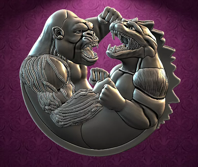 This image is a striking 3D digital sculpture that captures the iconic rivalry between King Kong and Godzilla. It's designed with a circular, medallion-like composition that highlights the raw power and tension of their clash.