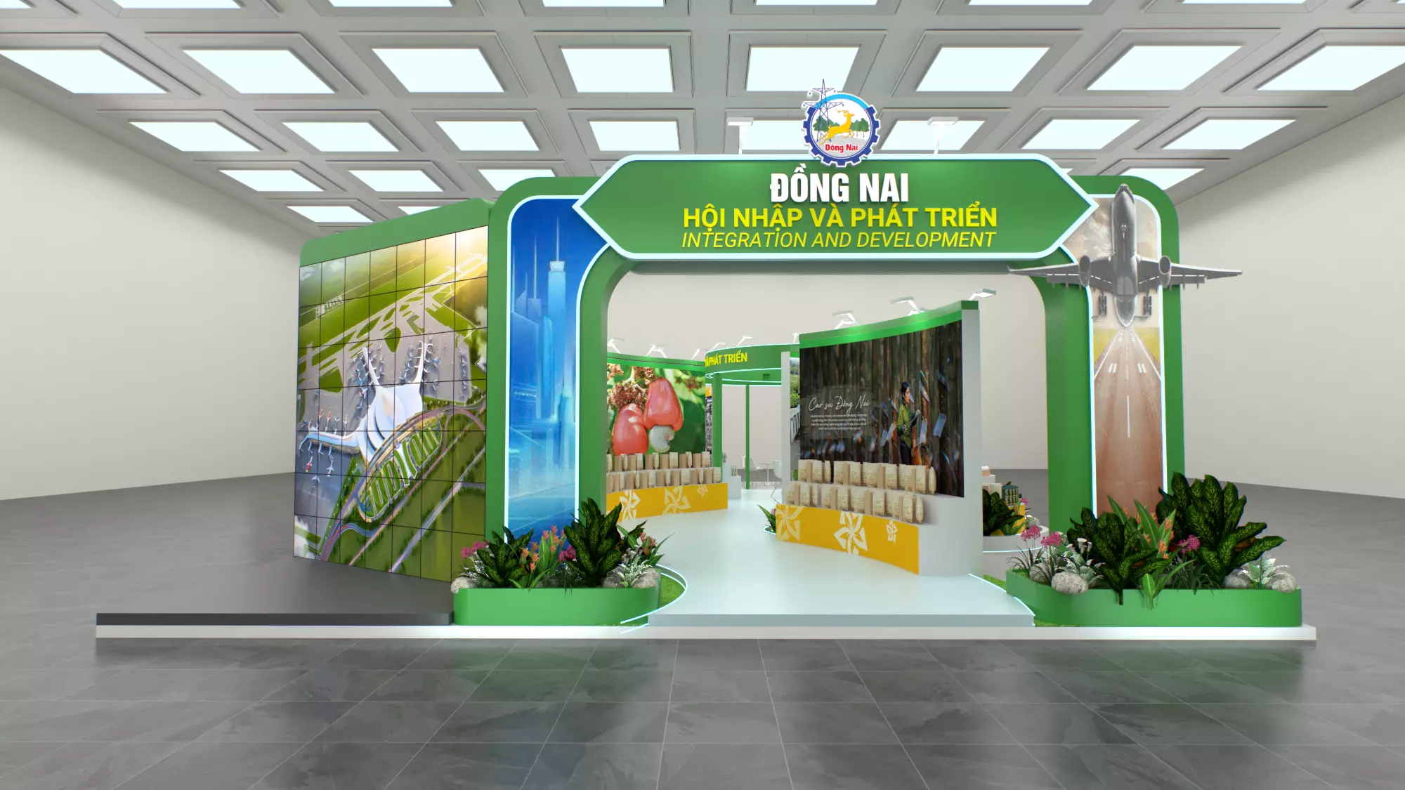The primary focal point is the grand, stylized entrance gate featuring the logo and bilingual slogan, flanked by miniature green landscapes that create a welcoming atmosphere. Inside, arc-shaped partitions serve to divide functional areas while acting as display surfaces for images promoting economic, cultural, and tourism achievements, alongside shelves for distinct local products. The lighting system and circular ceiling structure in the central area add spatial depth, while the light blue carpet clearly outlines the walkway for visitors. This design not only optimizes the display area but also effectively conveys the message of a Dong Nai that is rising strongly.
