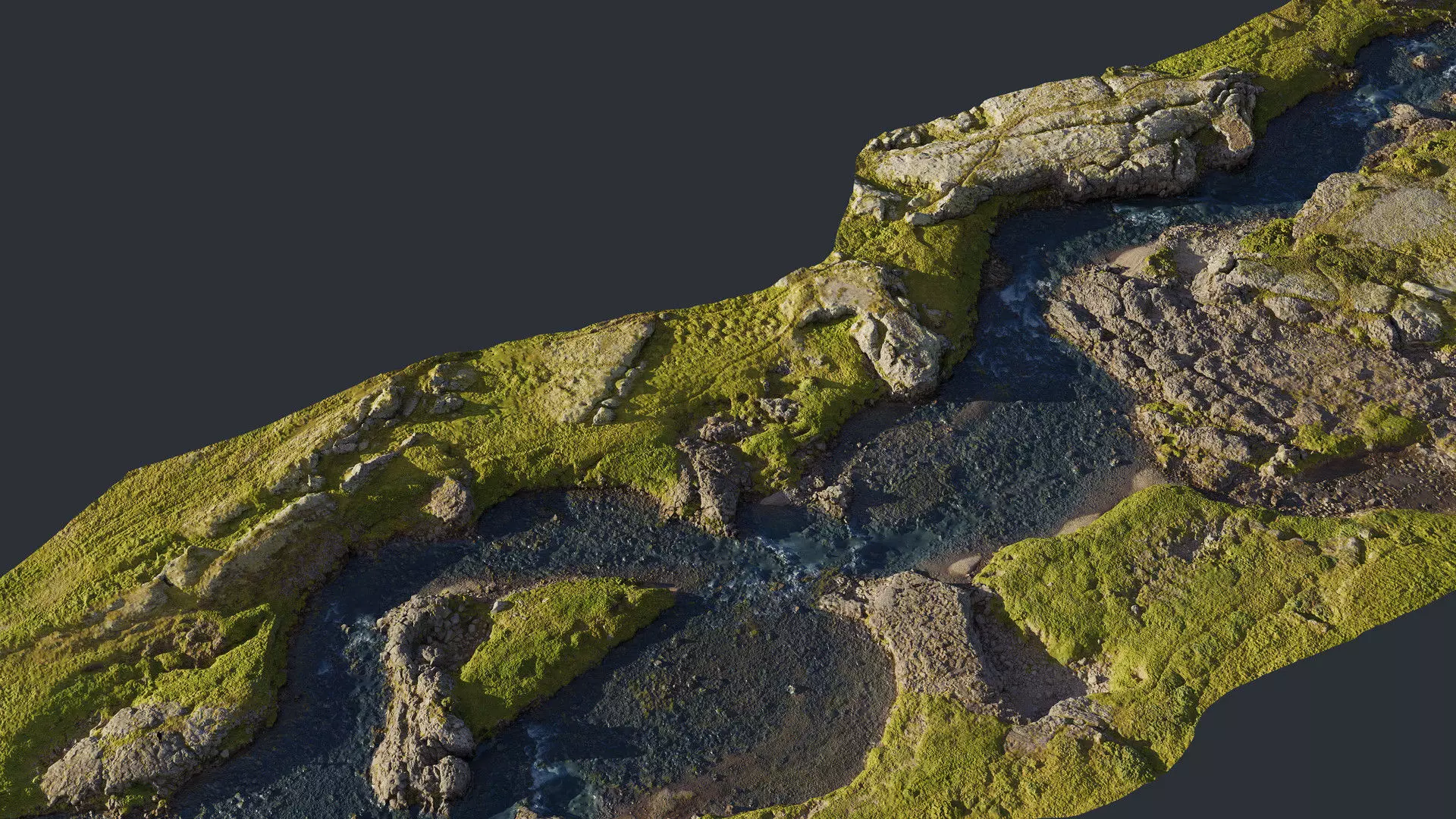 Big Nordic River - PBR ScanThis detailed 3D scan of a massive Icelandic river was captured in neutral lighting to ensure accurate surface detail and realistic color tones. The model has been carefully cleaned, decimated, and optimized for both real-time and offline rendering workflows.